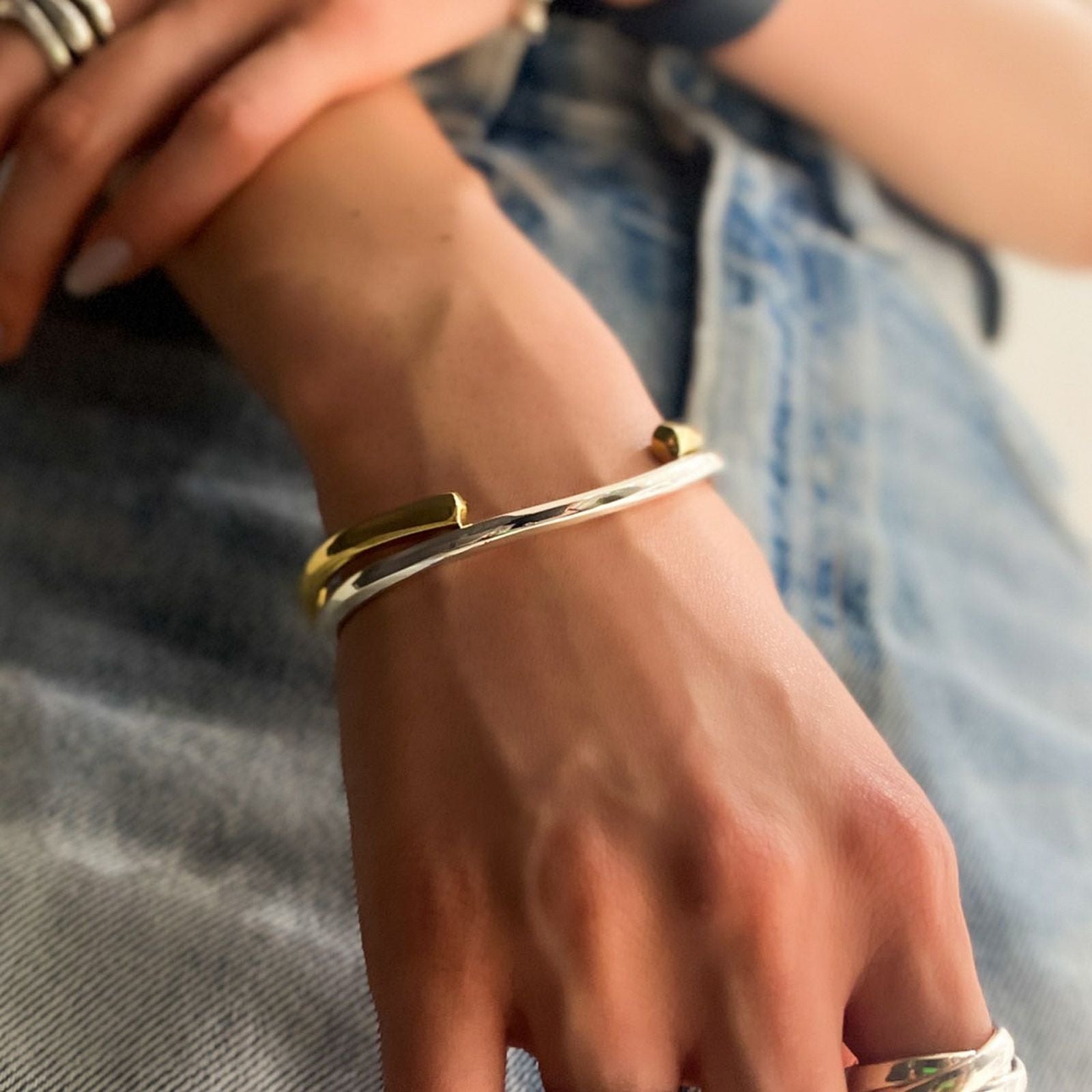 表面にさりげなくテクスチャーを施した「セイマ」のバングルです。