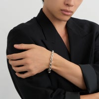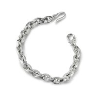 オリジナルのコマを繋ぎ合わせ、モダンなブレスレットに仕上げました。さりげなく一コマの両面には筆記体でブランドロゴが彫刻されいます。
