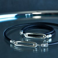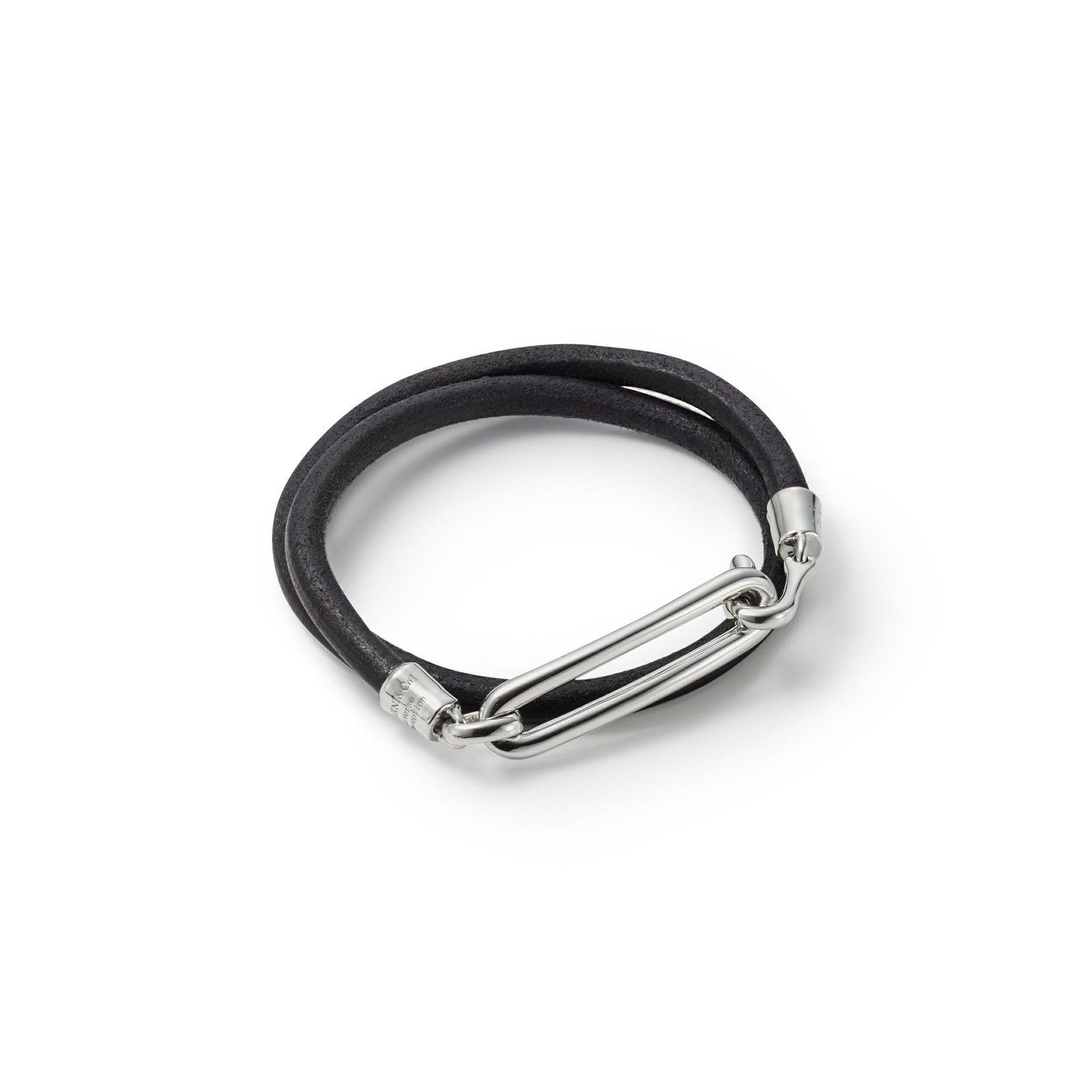 バウハウスを代表するデザイナーの一人マルセル・ブロイヤーの作品「ワシリーチェアー」のスチールパイプのフォルムをモチーフにしたパーツと、 5mm 幅のレザーコードを組み合わせています。