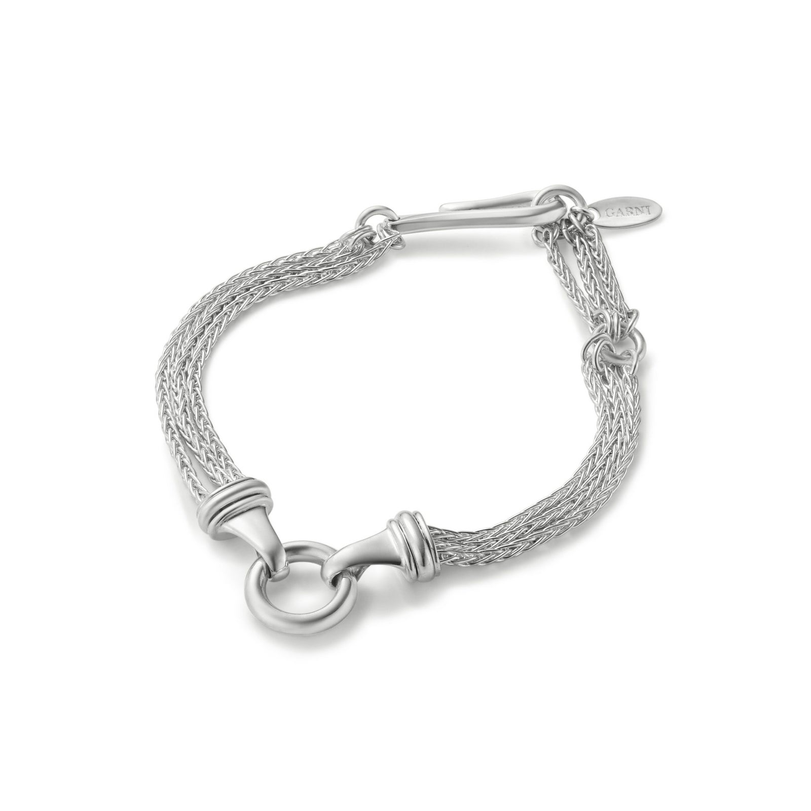 繊細なチェーンが束ねられ、センターに配されたサークルモチーフが印象的なブレスレットです。 19.5cm、17.0cmの2サイズに調節が可能です。 オリジナルアクセサリーケース付き。