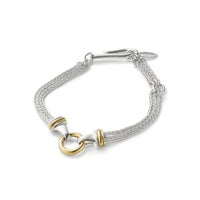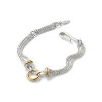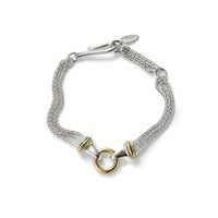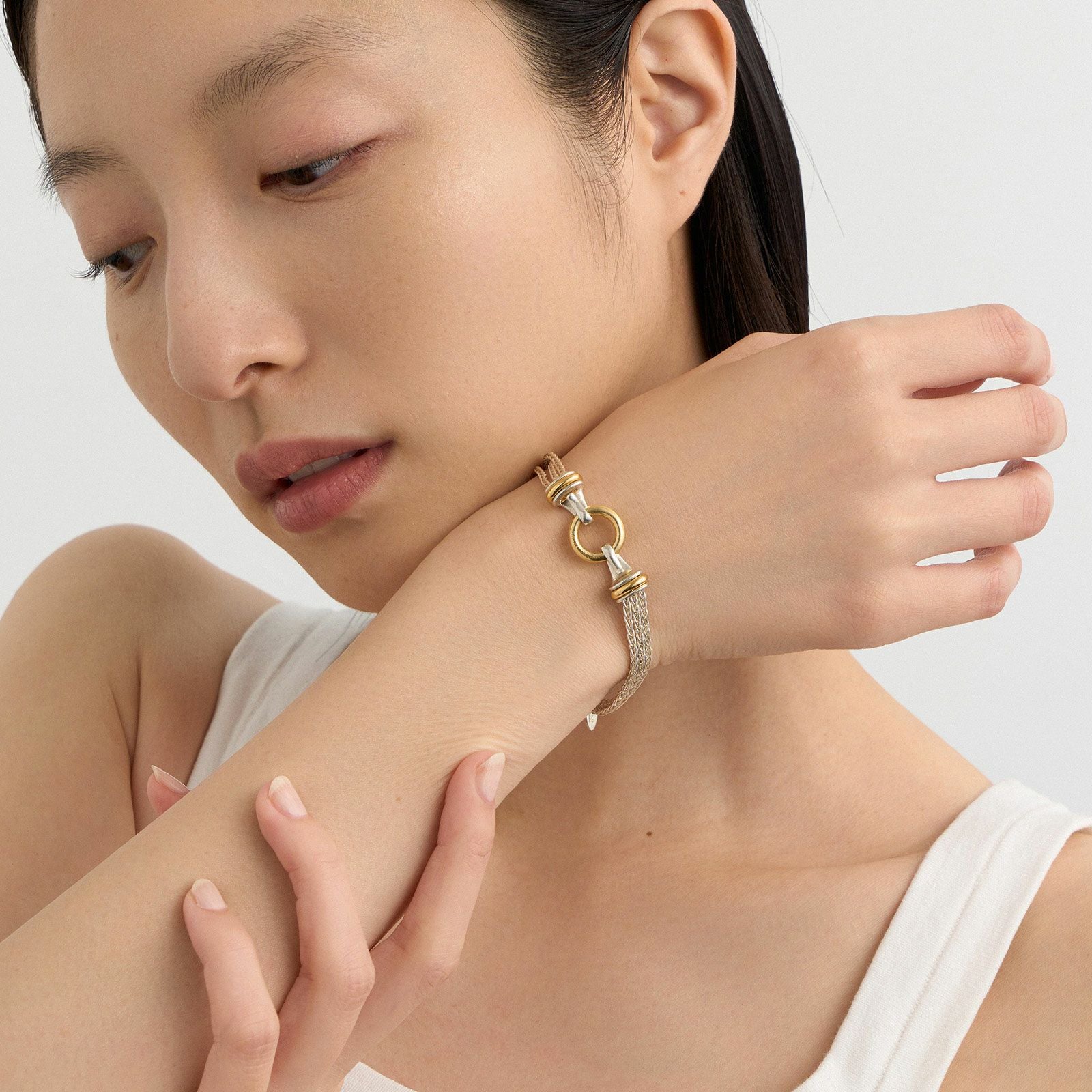 繊細なチェーンが束ねられ、センターに配されたサークルモチーフが印象的なブレスレットです。