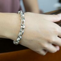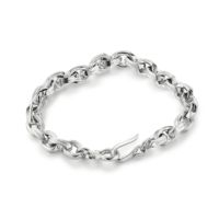 オリジナルのコマを繋ぎ合わせ、モダンなブレスレットに仕上げました。さりげなく一コマの両面には筆記体でブランドロゴが彫刻されいます。