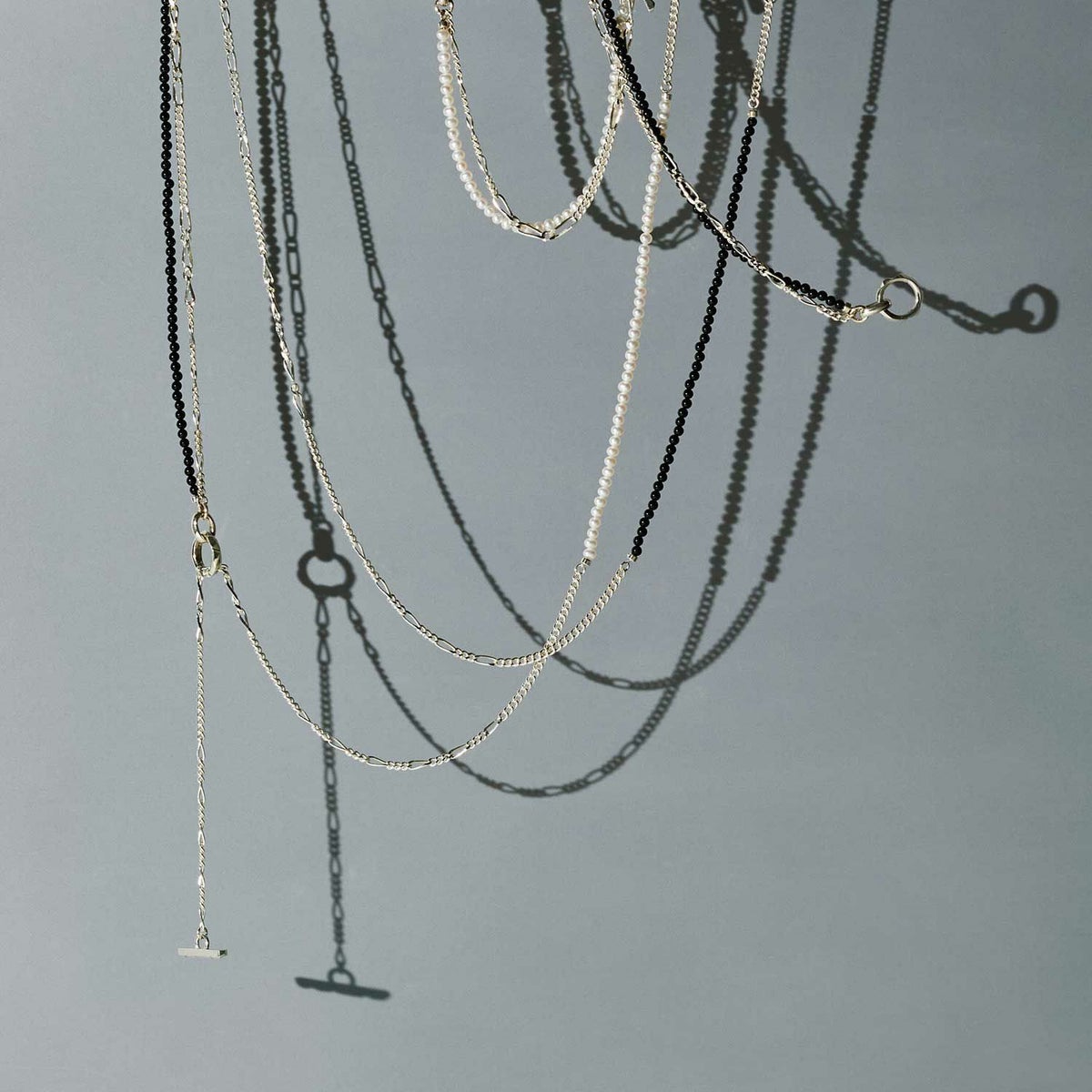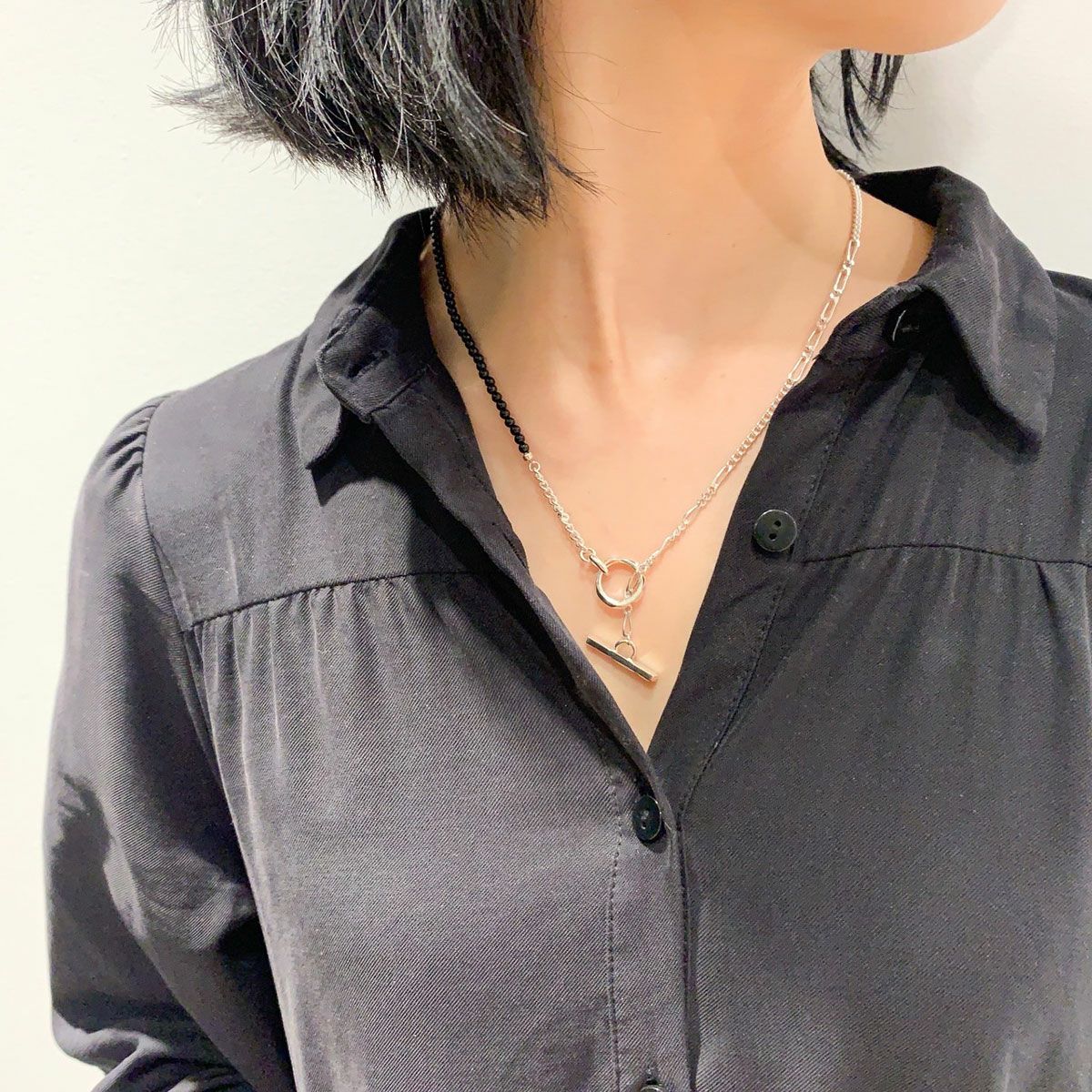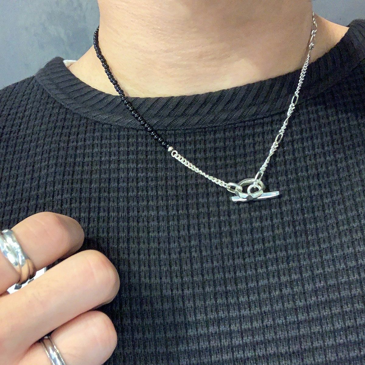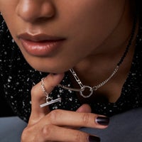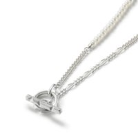 3種類のチェーンで組み上げたMix Chain Necklace No.1に、今季は更にオニキスやパールをミックスさせたラグジュアリー感漂うハイブリッドな”クラッシュミックスチェーン"。 こちらは着け方をアレンジしていただけるデザインのネックレスです。 ポイントになる留め具パーツは独創的なフォルムの"Clash"デザインを採用。小粒のオニキスとパールを使用し、ジェンダーレスに着用できる仕上がりです。 オリジナルアクセサリーケース付き。 《注意事項》 ・フープに1度通しただけでは、使い方によって外れてしまう可能性があります。チェーンを2重にフープに通すと外れにくくなります。 【CLASH】COLLECTION >商品一覧はこちら