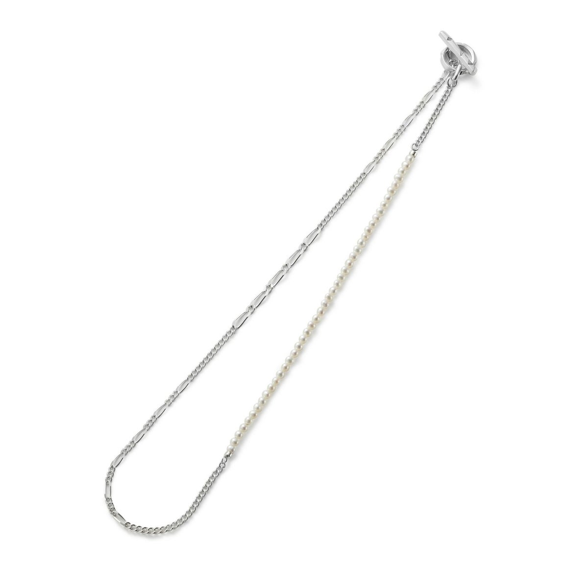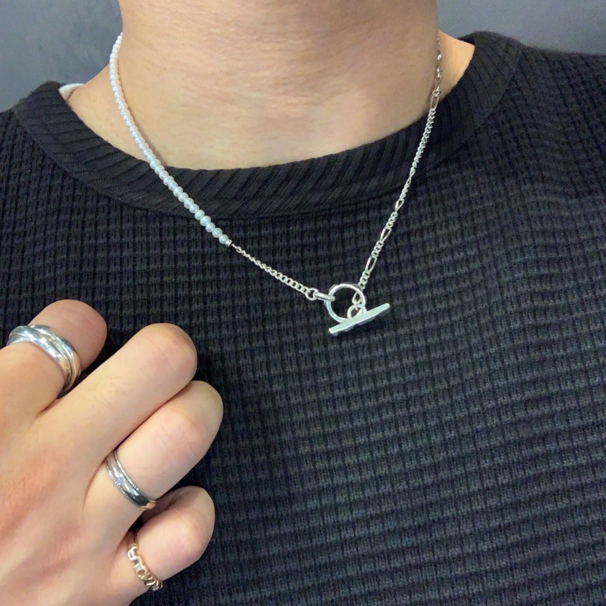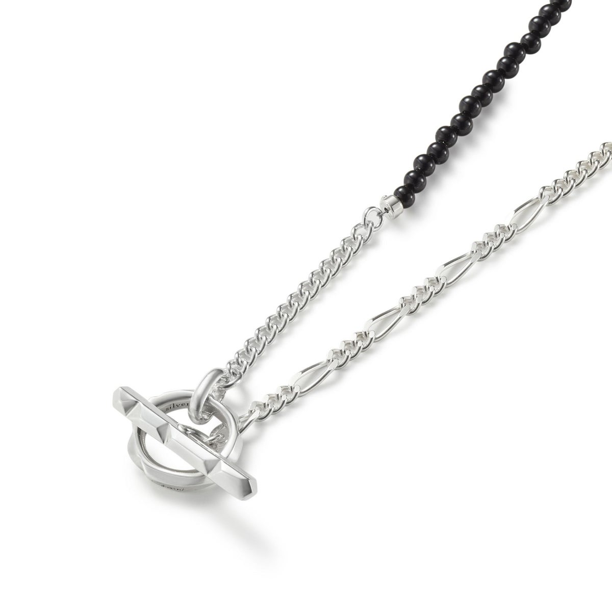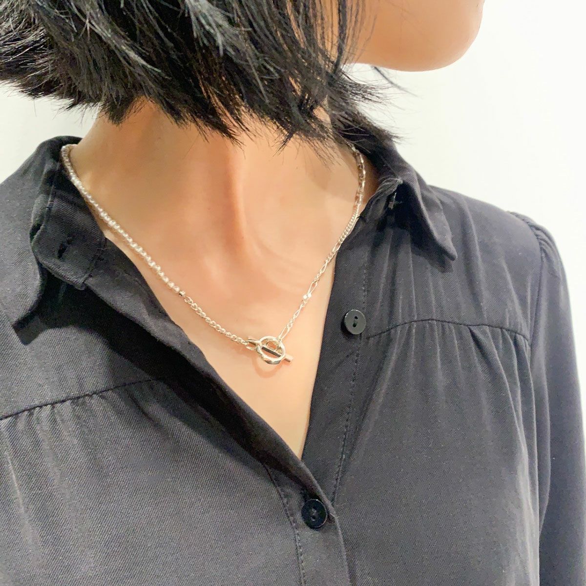 3種類のチェーンで組み上げたMix Chain Necklace No.1に、今季は更にオニキスやパールをミックスさせたラグジュアリー感漂うハイブリッドな”クラッシュミックスチェーン"。 こちらは着け方をアレンジしていただけるデザインのネックレスです。 ポイントになる留め具パーツは独創的なフォルムの"Clash"デザインを採用。小粒のオニキスとパールを使用し、ジェンダーレスに着用できる仕上がりです。 オリジナルアクセサリーケース付き。 《注意事項》 ・フープに1度通しただけでは、使い方によって外れてしまう可能性があります。チェーンを2重にフープに通すと外れにくくなります。 【CLASH】COLLECTION >商品一覧はこちら