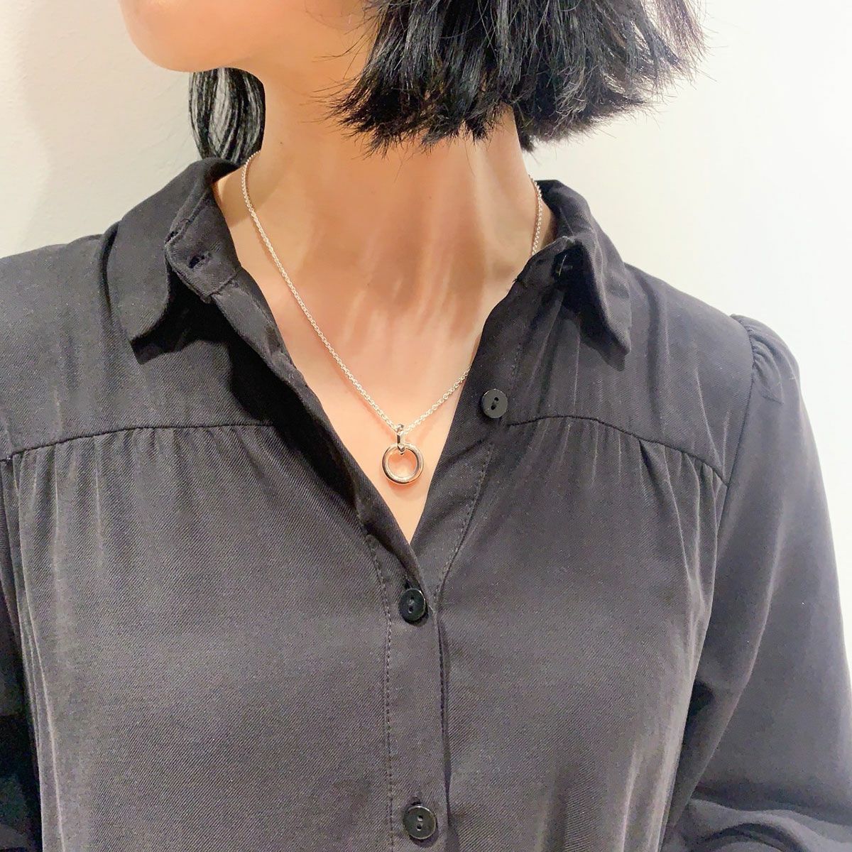 独創的なフォルムの"Clash"デザインとクラフト感のあるプレーンなデザインを組み合わせた、ジェンダーレスに着用できる"クラッシュコンビ"。 こちらはミドルサイズのリングモチーフのペンダントです。 トップとチェーンを繋ぐバチカン部分に施した"Clash"デザインがアクセントになっています。 アジャスターでチェーンの長さを7cm調整可能です。チェーンはペンダントトップから外れない仕様になっています。 オリジナルアクセサリーケース付き。 【CLASH】COLLECTION >商品一覧はこちら