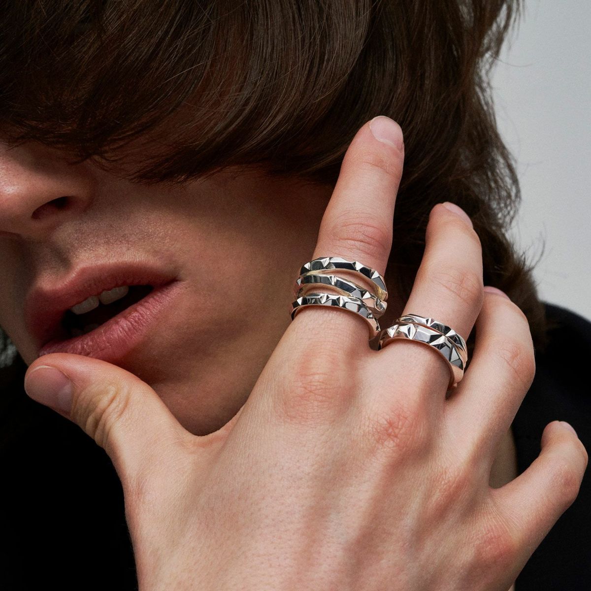 独創的なフォルムの"Clash"デザインを施したリングを3本重ねたような幅広なリングです。 際立つ存在感で手元にアクセントを加えます。 オリジナルアクセサリーケース付き。 ※在庫がない号数については受注製作いたします。 「メールでお問い合わせ」ボタンを押してお問い合わせフォームよりご希望の号数をお送りください。 お客様専用商品をお作りいたしますので、商品のお渡しは約6週間後となります。 【CLASH】COLLECTION >商品一覧はこちら