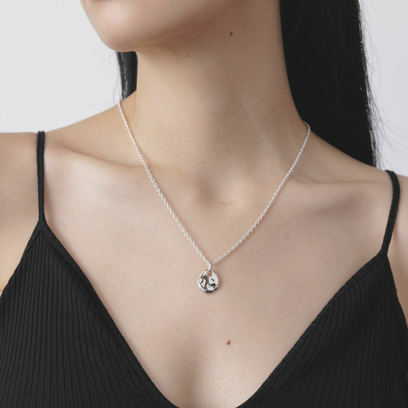 ペンダントトップは円の側面を削り、そして表面にはテクスチャーを施して、全体の雰囲気をオリジナリティーのあるペンダントに仕上げています。