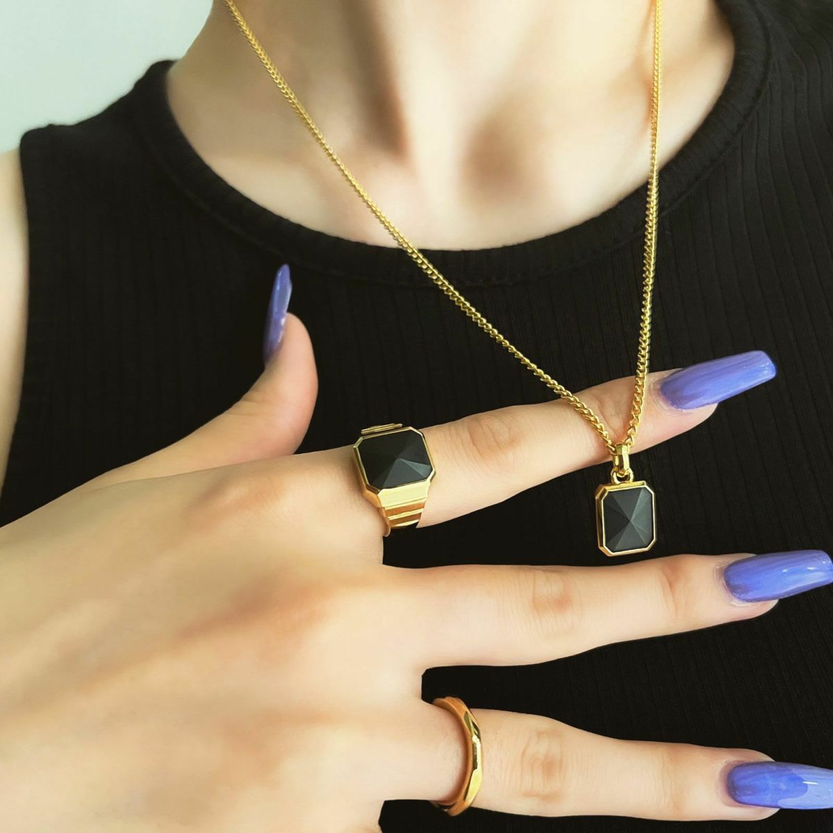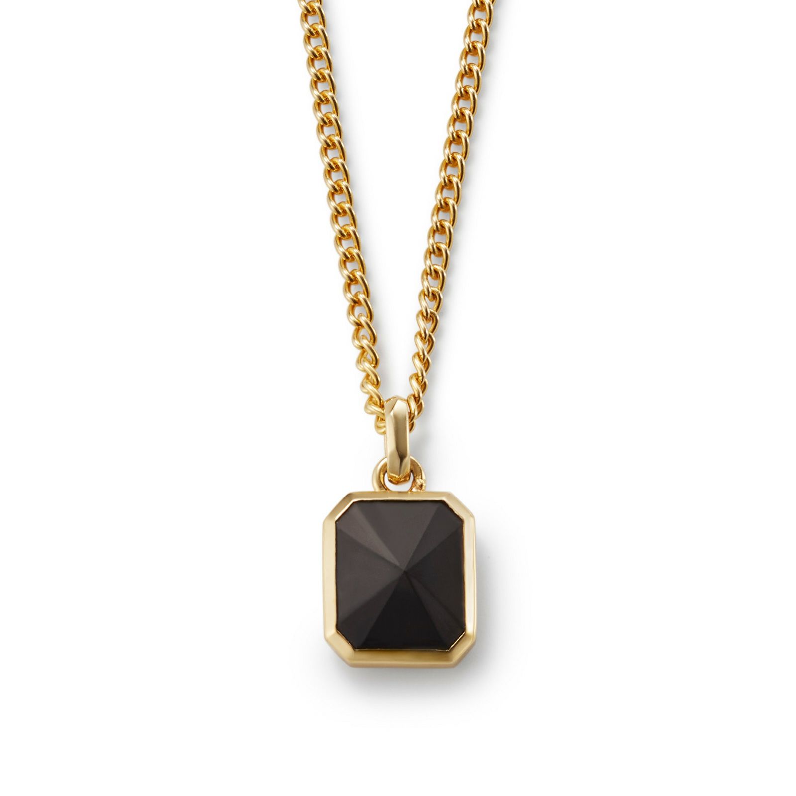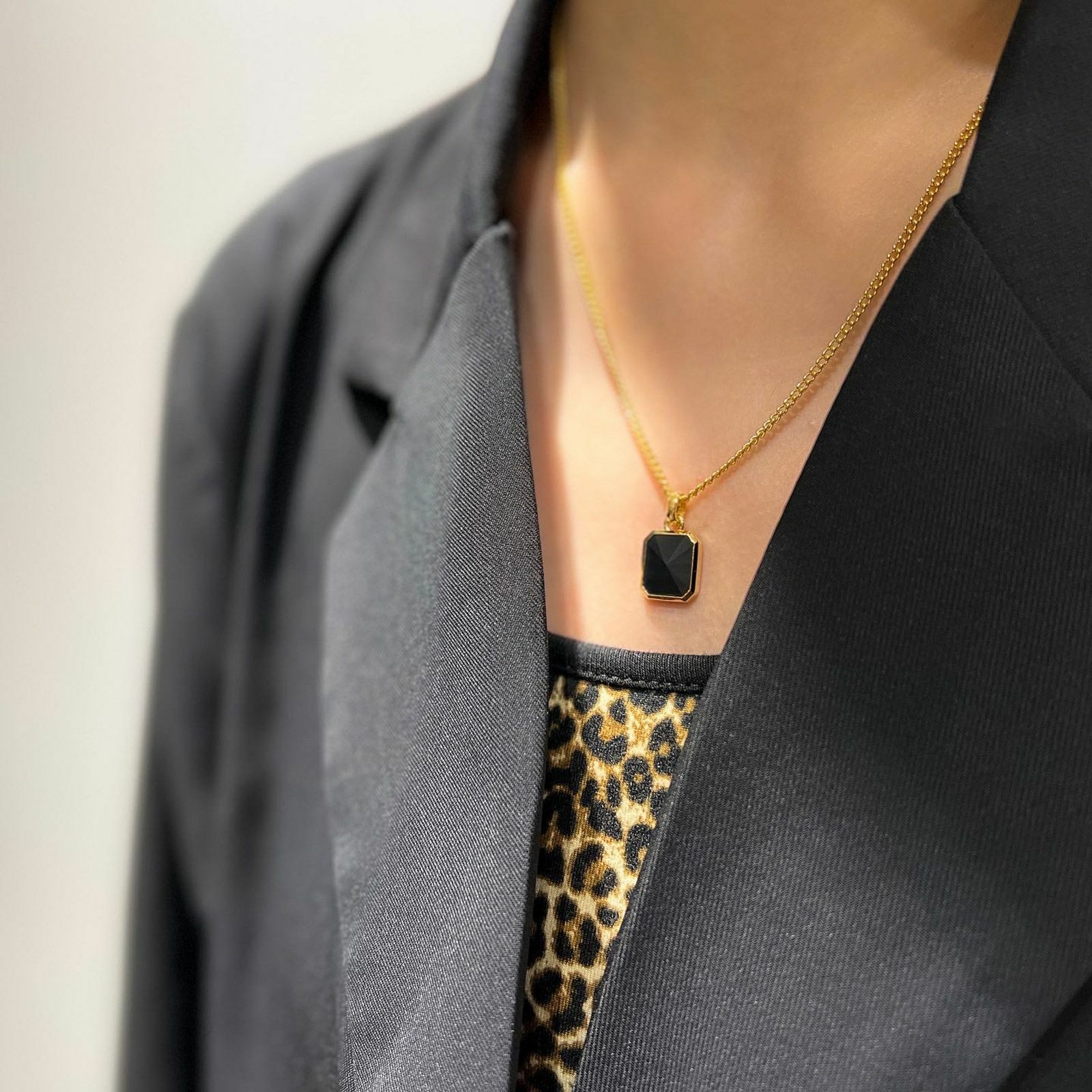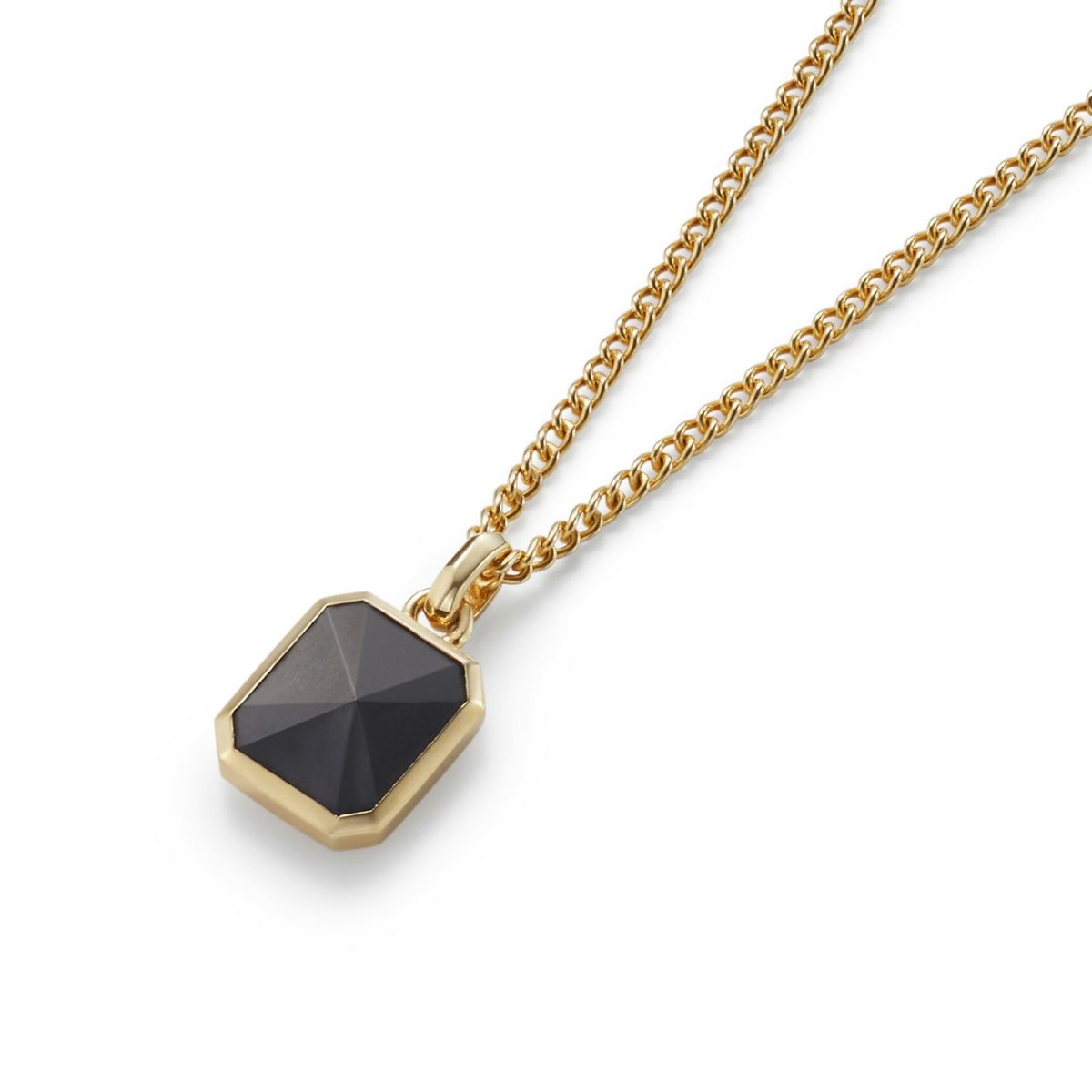 アール・デコから着想を得た幾何学的なフォルムに、オリジナルカット の天然石をセッティングしたペンダントです。 BLACKの天然石はスタイリッシュな印象のマットブラックのオニキスを使用しています。 ベースカラーのGOLDはSilver 925にK18 Gold Plated(ゴールドコーティング)を施しています。 アジャスターでチェーンの長さを7cm調整可能です。チェーンはペンダントトップから外れない仕様になっています。 オリジナルアクセサリーケース付き。