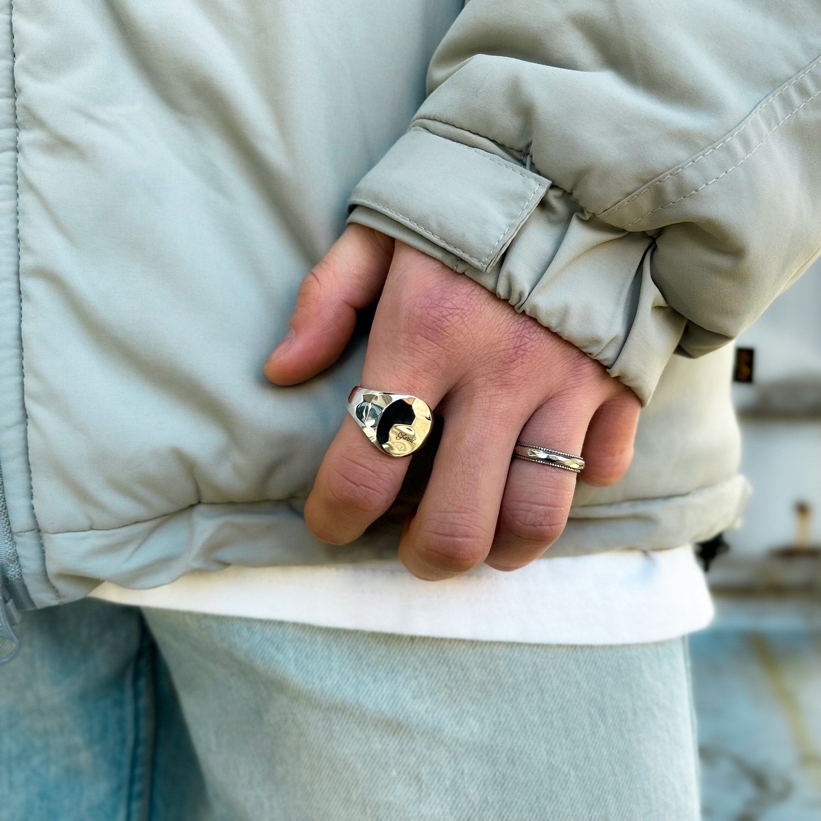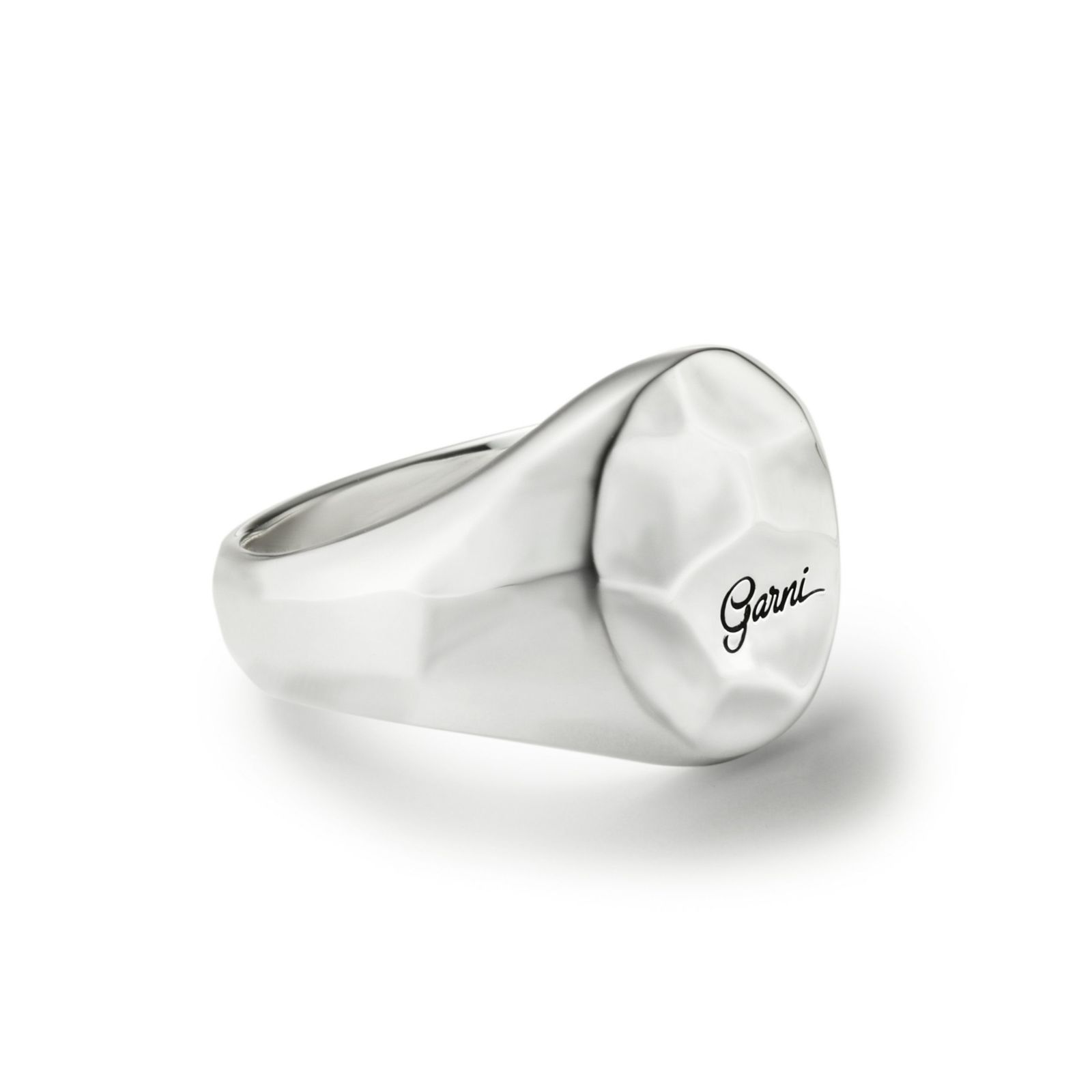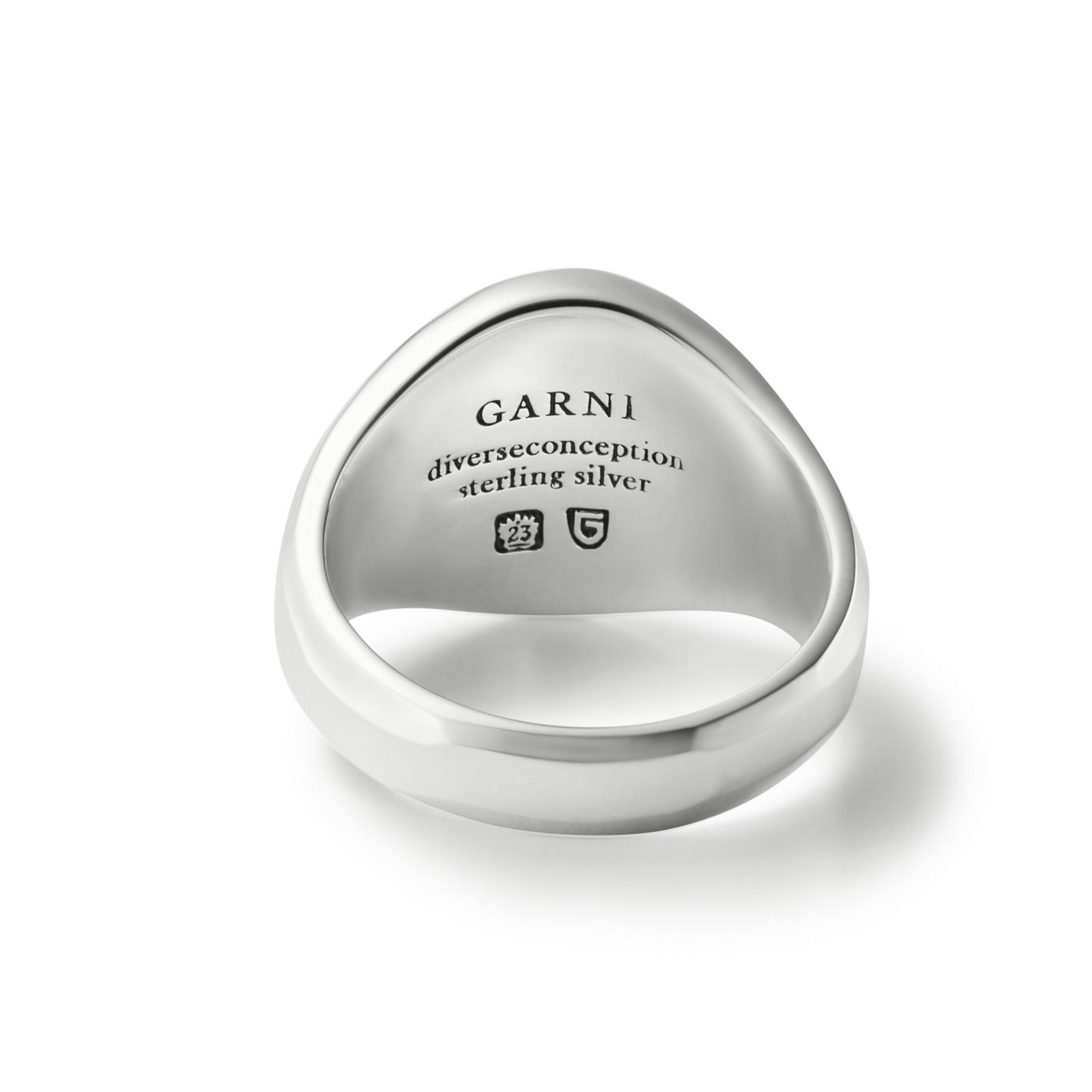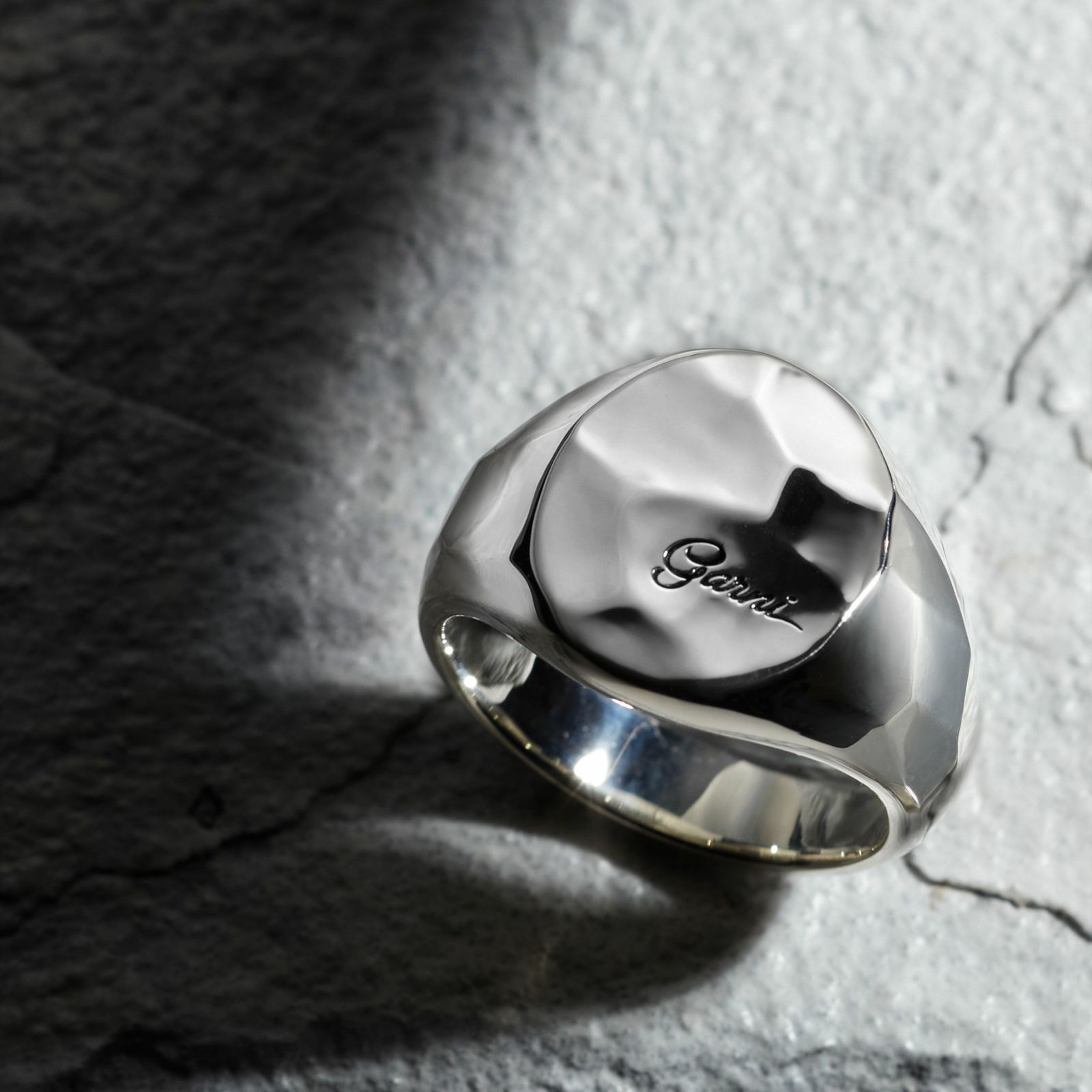 オリジナルフォントの新しいロゴを彫刻しました。シンプルな造形ですが、ガルニ独自のカッティング技法が使用され、シルバーの輝きを存分に発揮することのできるデザイン、Essential(本質的)です。