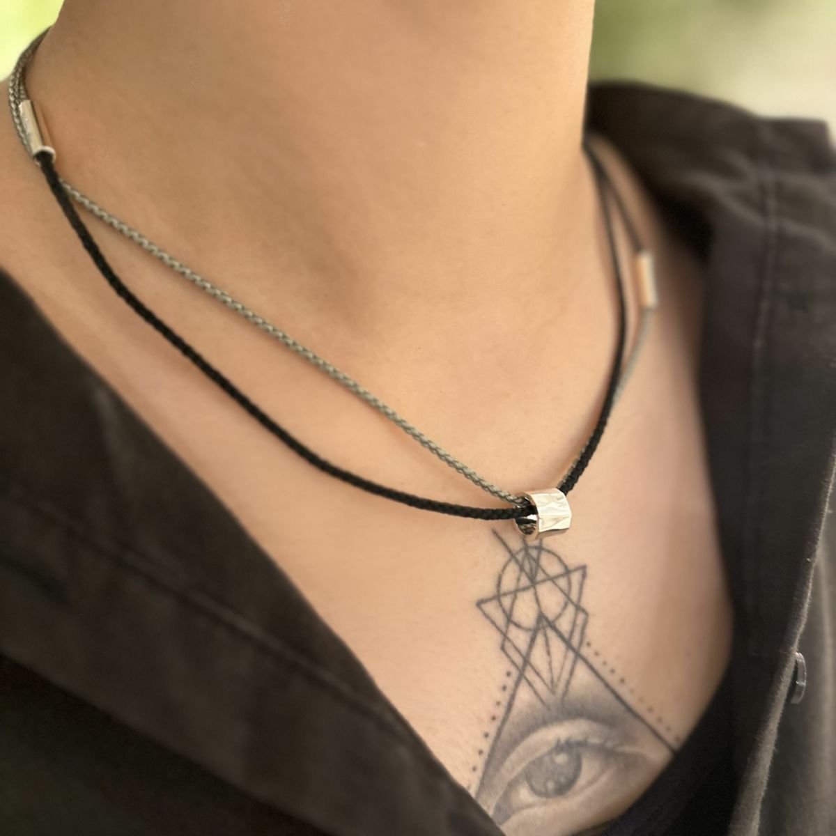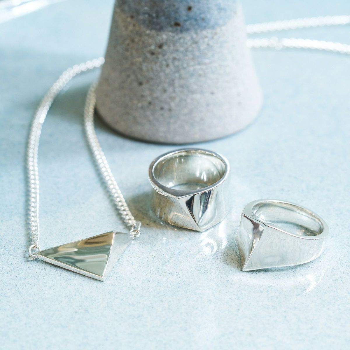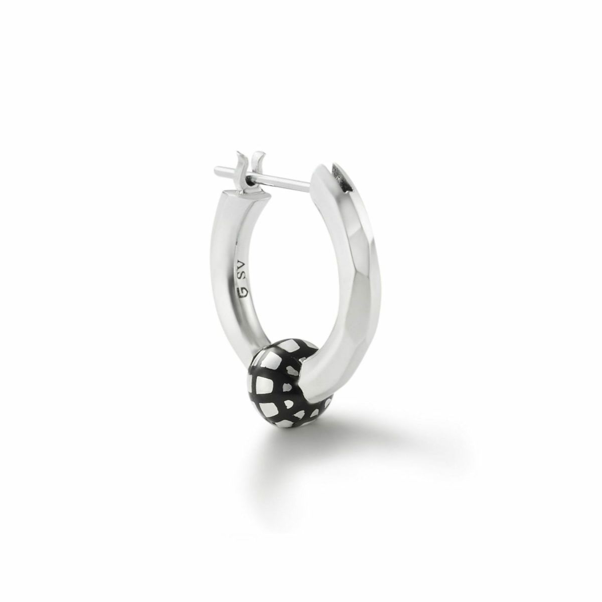 シルバーと様々な素材を組み合わせて表現したデザインは、幾何的な質感とカラーリングが特徴的です。