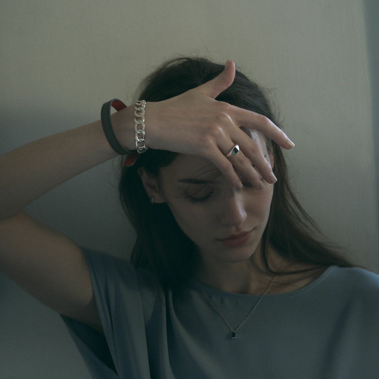 チェーン部分は一見プレーンなフォルムですが、表面にテクスチャーを施すことで独自の表情を醸し出します。レザー部分はガラス仕上げの牛革にゴムのような手触りの艶消し感触剤を塗り込むことで、ゴム引きのような風合いを出しています。