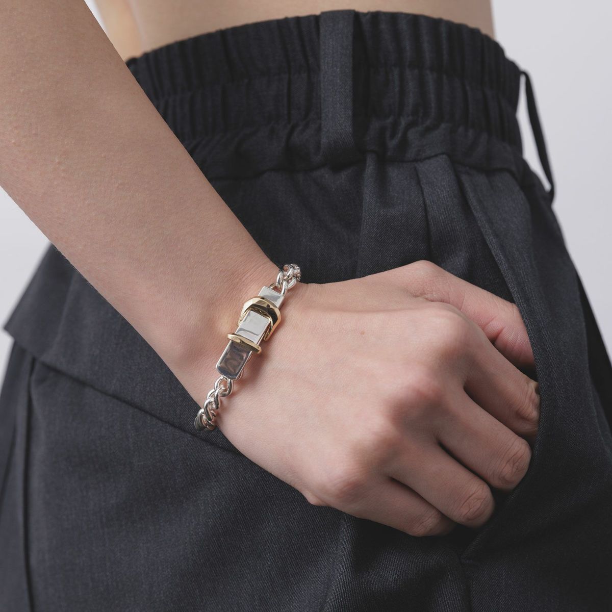 バックルとループパーツにはK18 イエローゴールドを使用。シルバーとゴールドのコンビネーションが高級感を引き立てます。