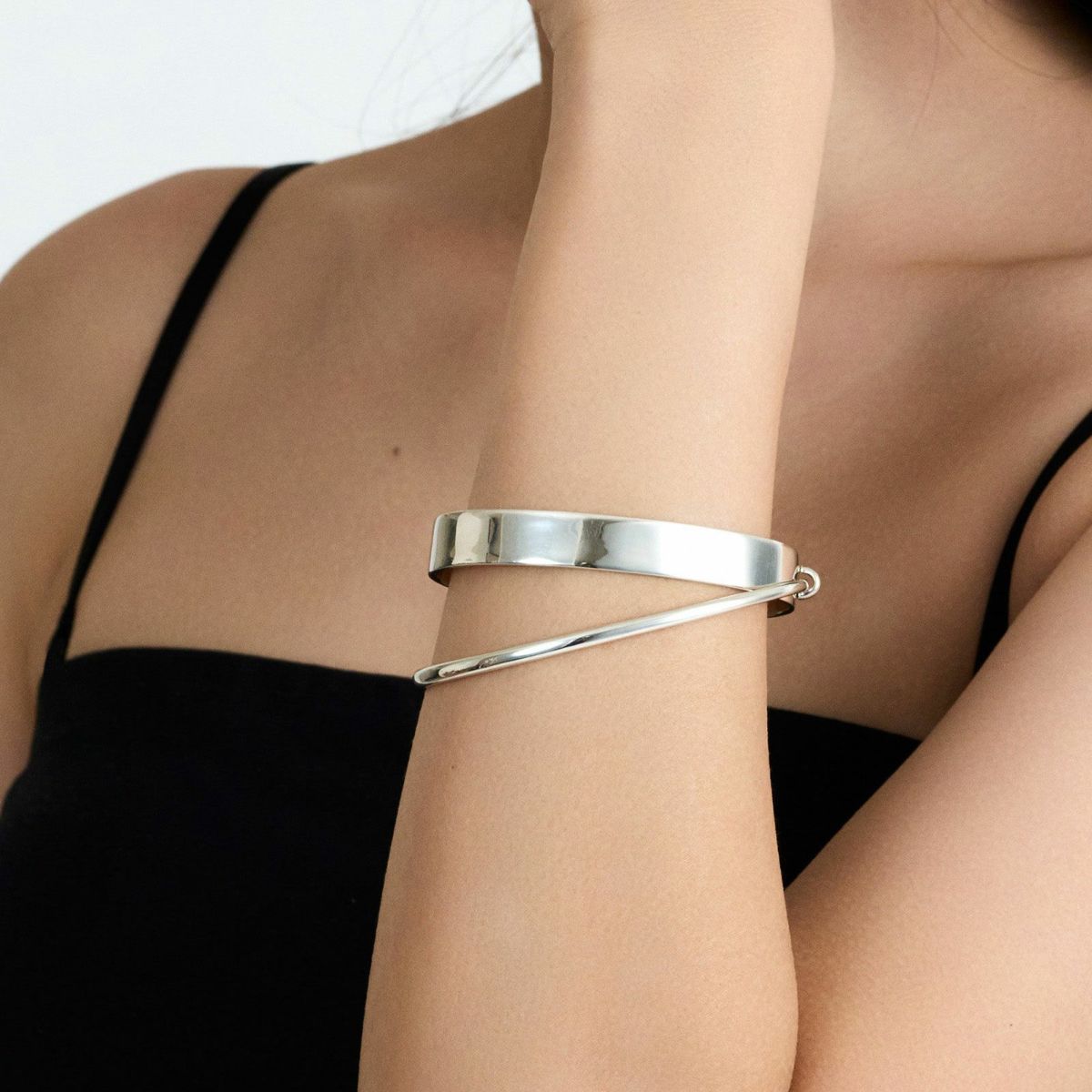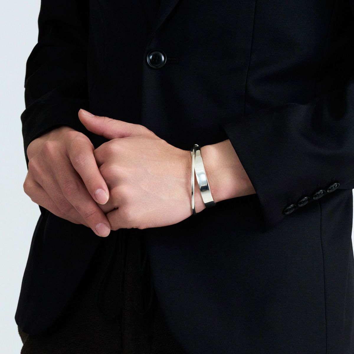 「平打ち」と「甲丸」、印象が異なる形状を組み合わせてモダンに仕上げたバングルです。 オリジナルアクセサリーケース付き。