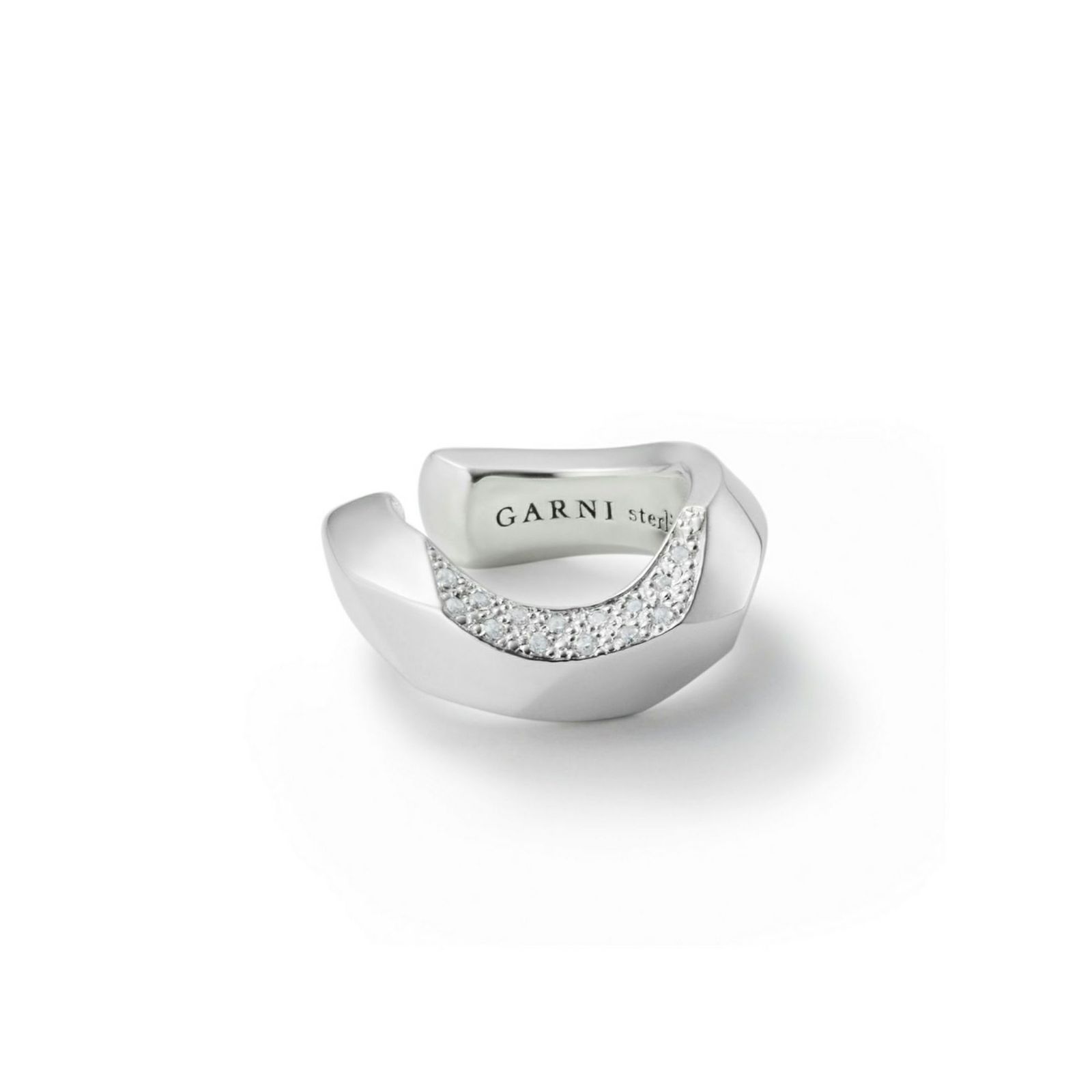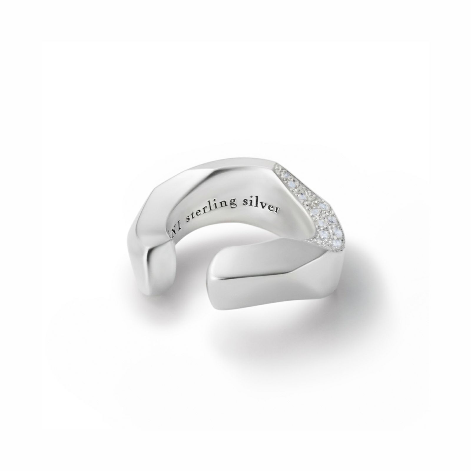 なめらかながらエッジーなリングの形状に一箇所深く削り出した「チップ」のイヤーカフです。 削り出した面に0.9mmのキュービックジルコニアを14ピースセットしています。 オリジナルアクセサリーケース付き。