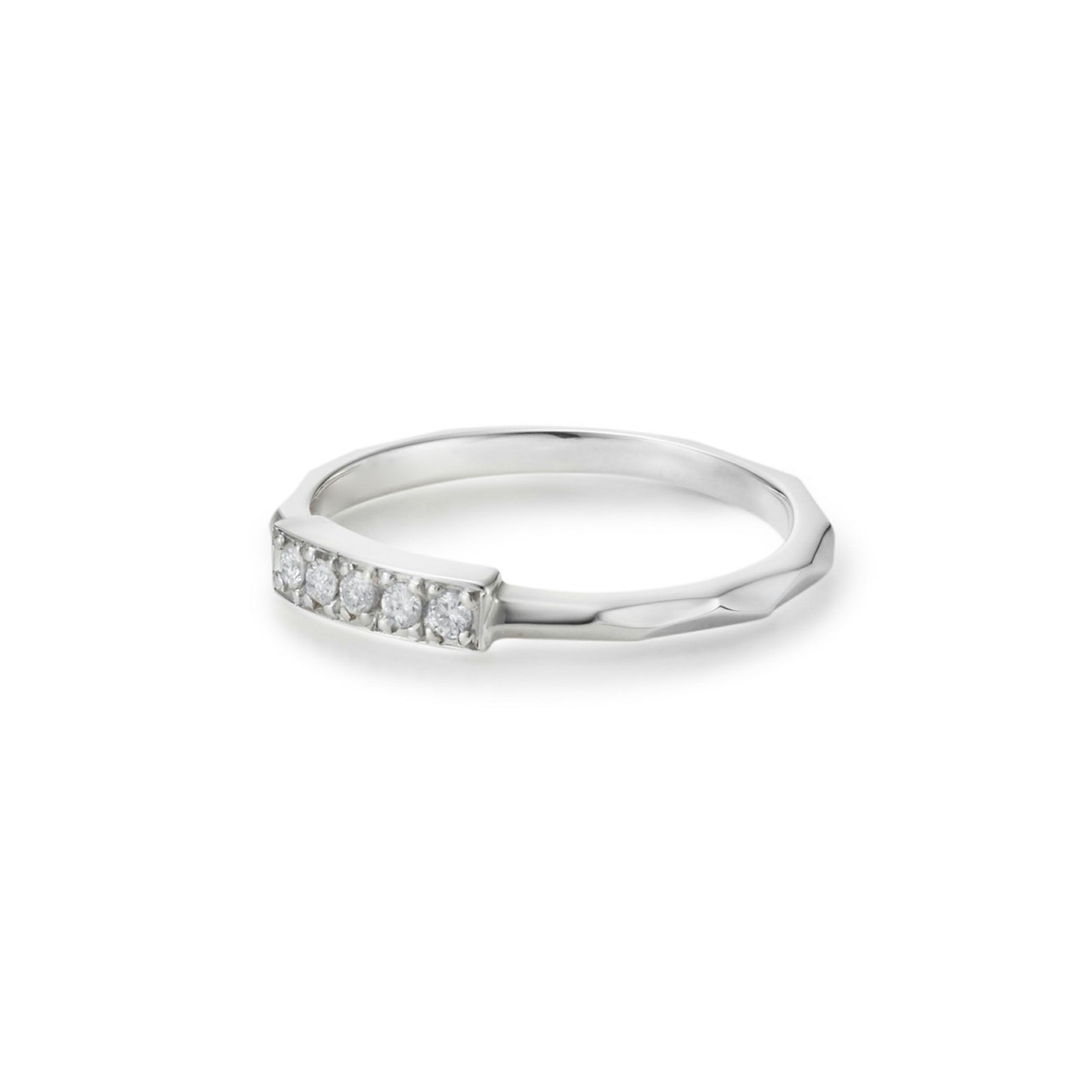 サイドアーム部分にGARNI独自の細やかなカッティングを施し、中央にダイヤモンド5石をレール爪留でセット。表面の細部までデザイン性を追求しカッティングを施したマリッジリングです。