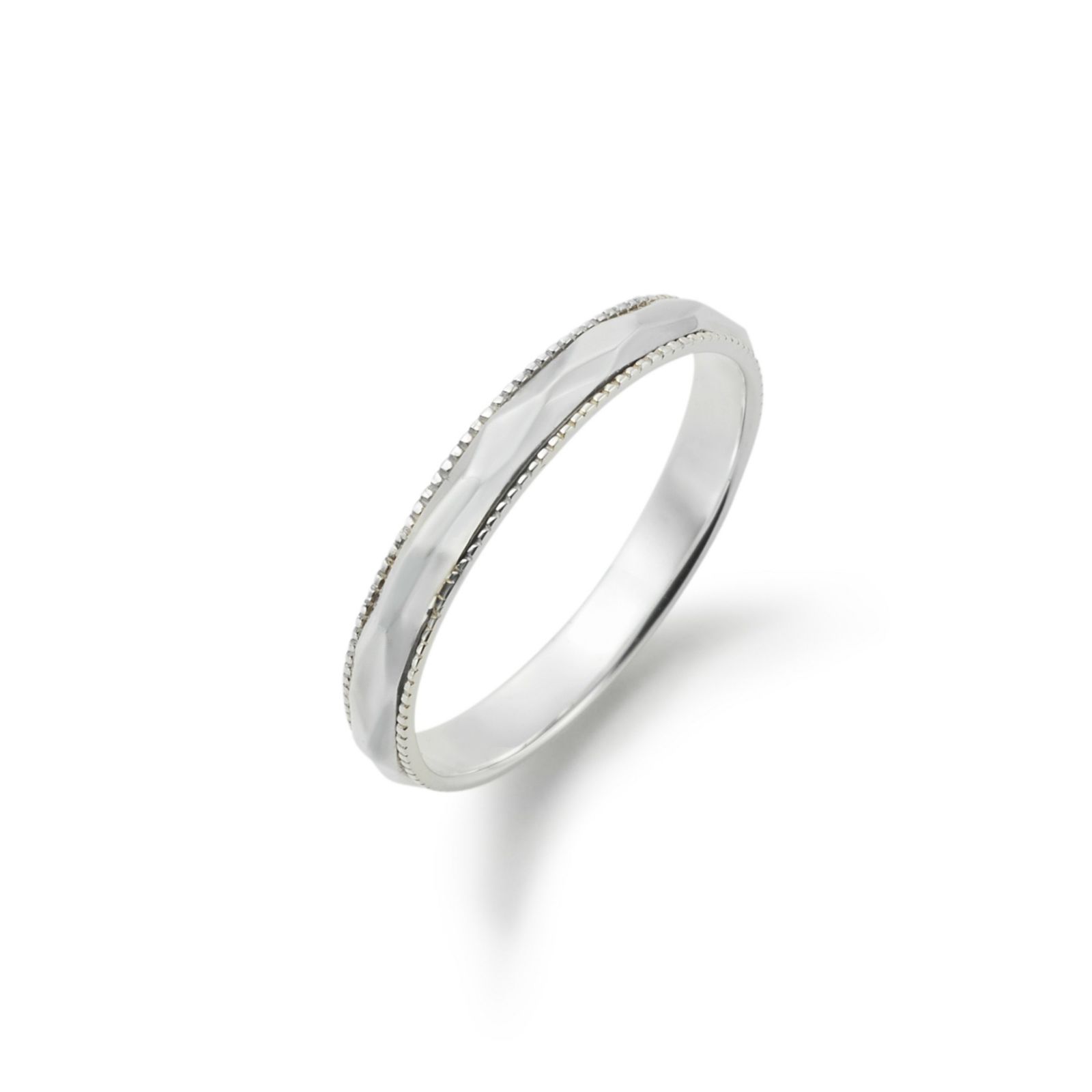 表面のテクスチャーを感じられるクラックシリーズのリングに、永遠を表現したミルを施した華やかな印象のマリッジリング。