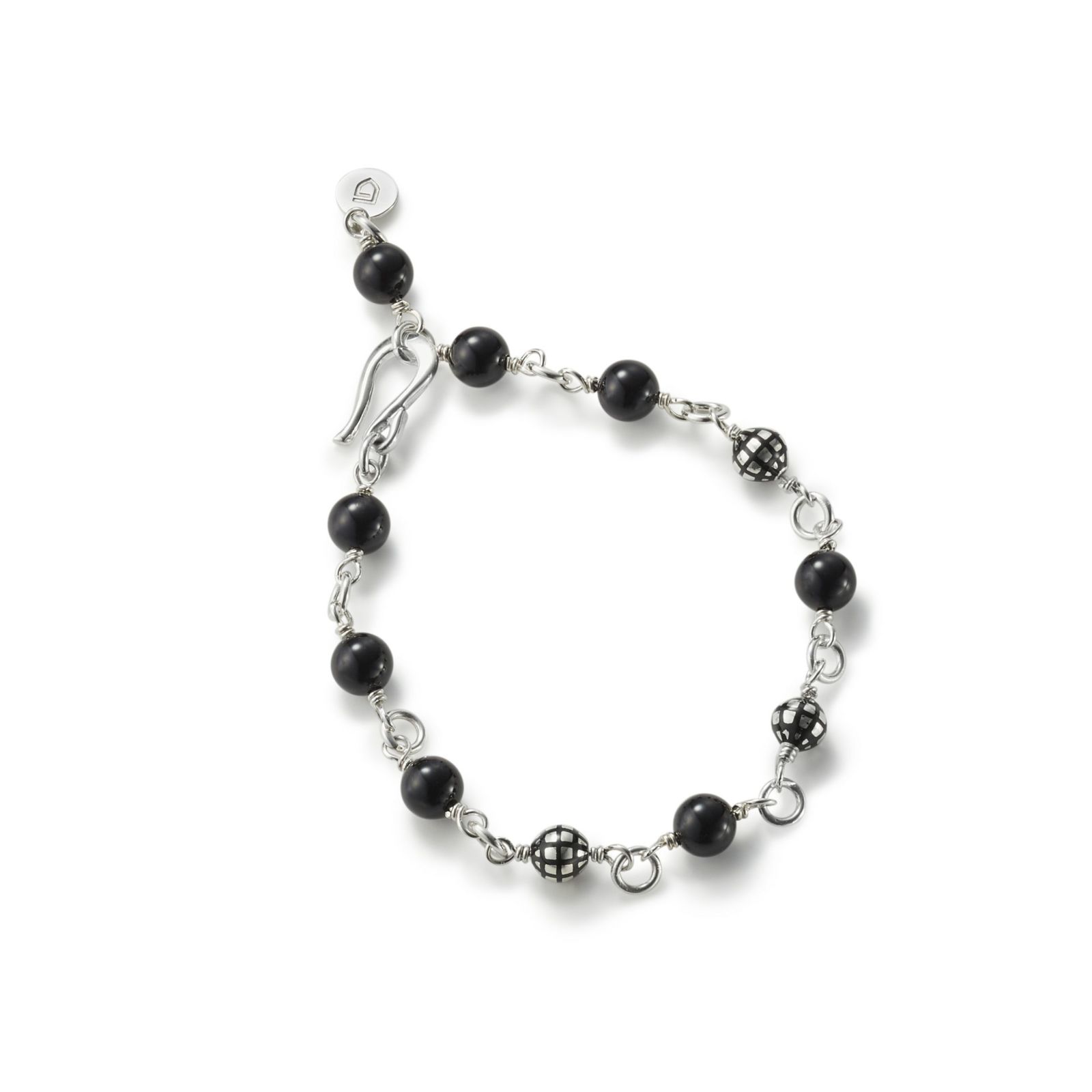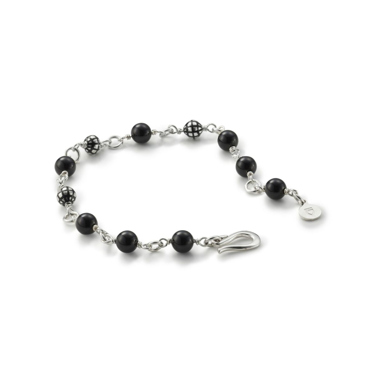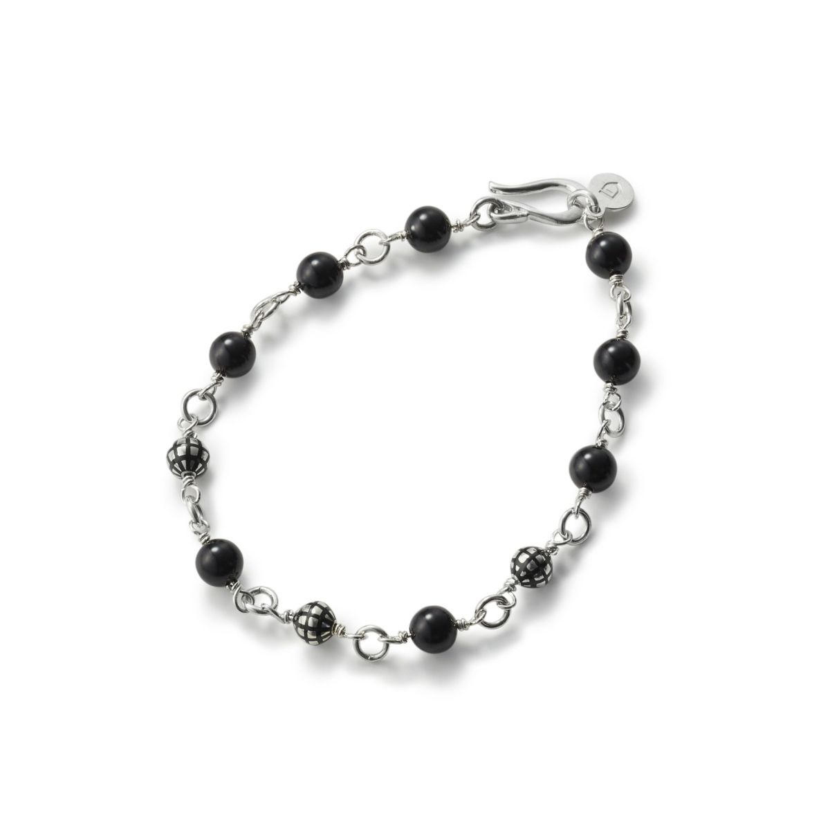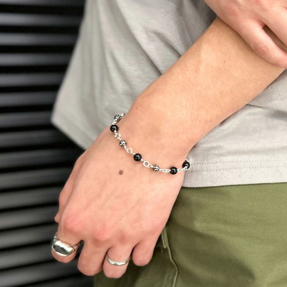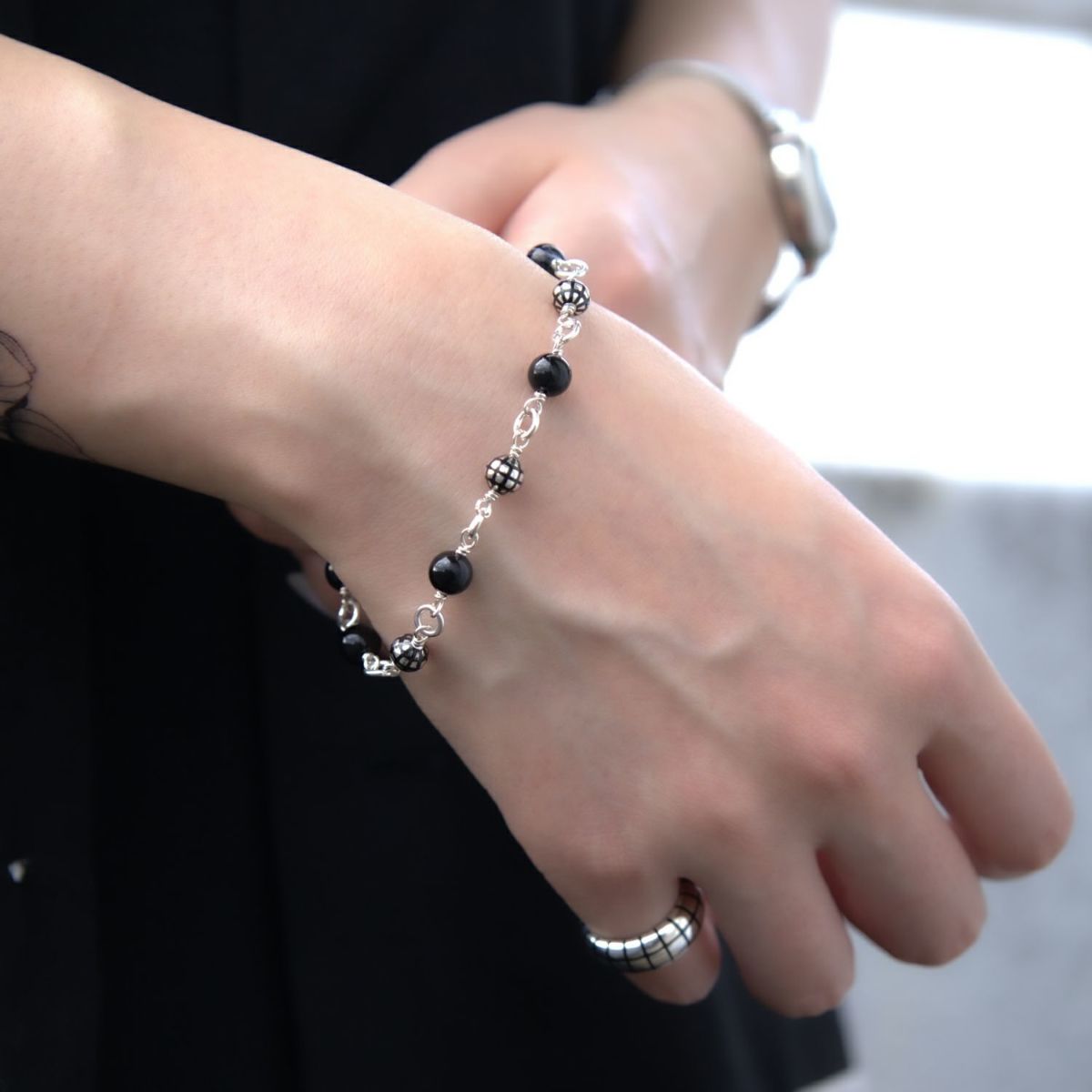 シルバー925 (スターリングシルバー)ビーズと天然石オニキス製ビーズを繋いでいる丸カンにフックを引っ掛けてサイズ調整可能なので、ジェンダーレスに着用出来るデザインです。