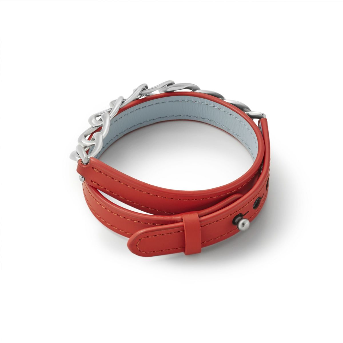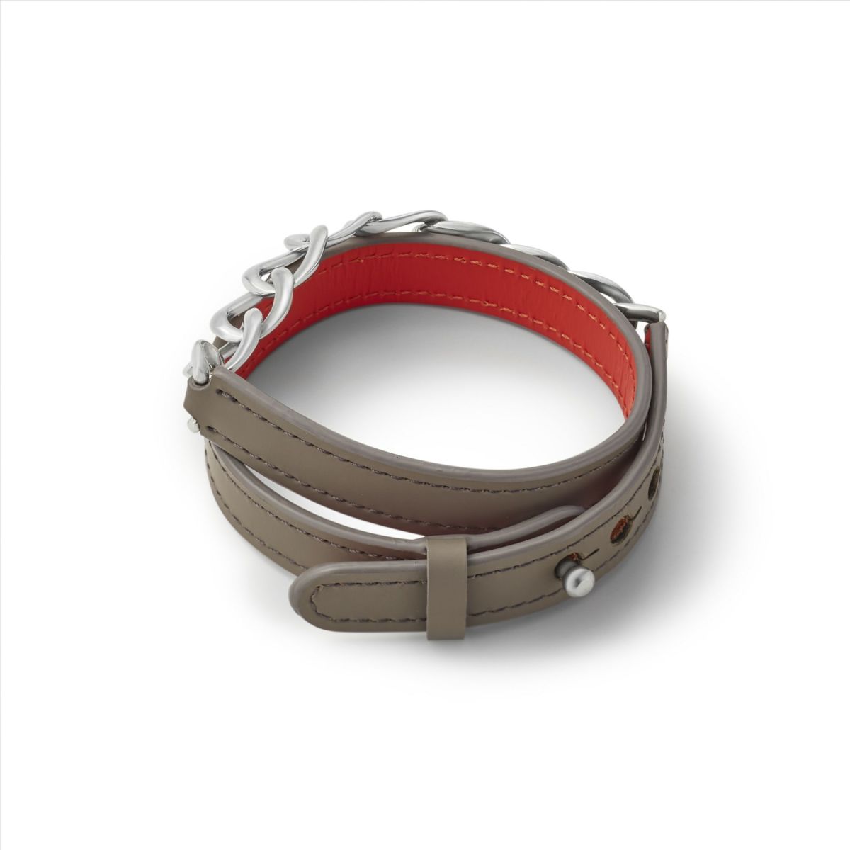 チェーン部分は一見プレーンなフォルムですが、表面にテクスチャーを施すことで独自の表情を醸し出します。レザー部分はガラス仕上げの牛革にゴムのような手触りの艶消し感触剤を塗り込むことで、ゴム引きのような風合いを出しています。