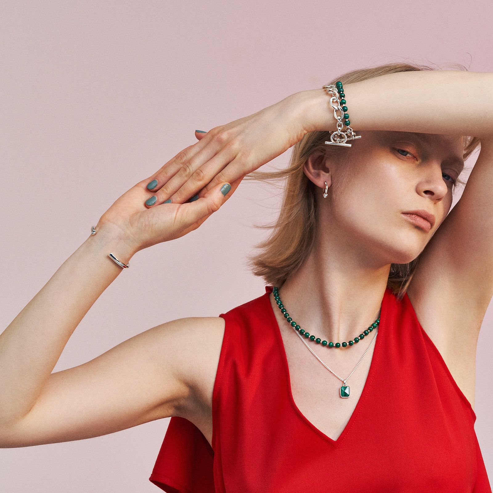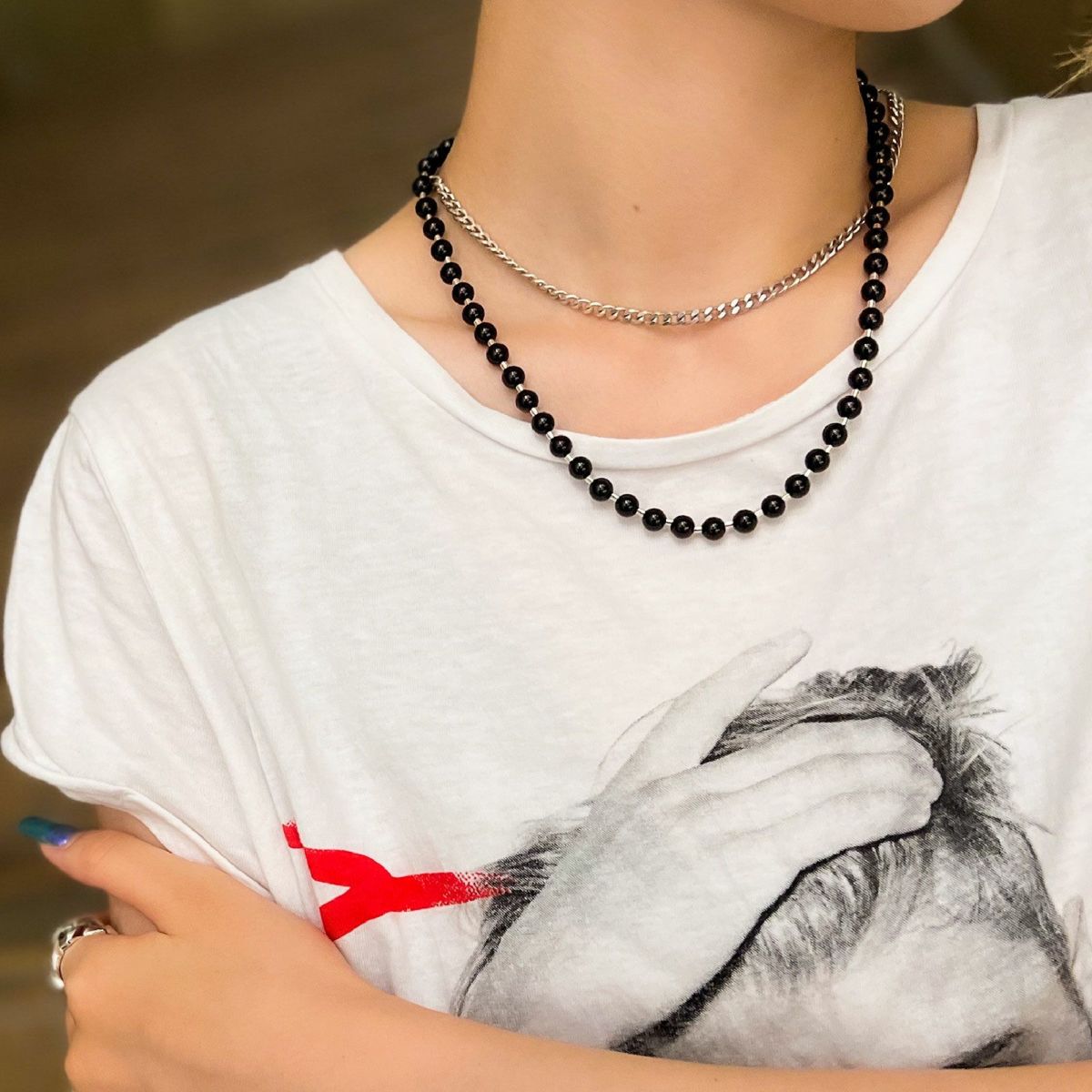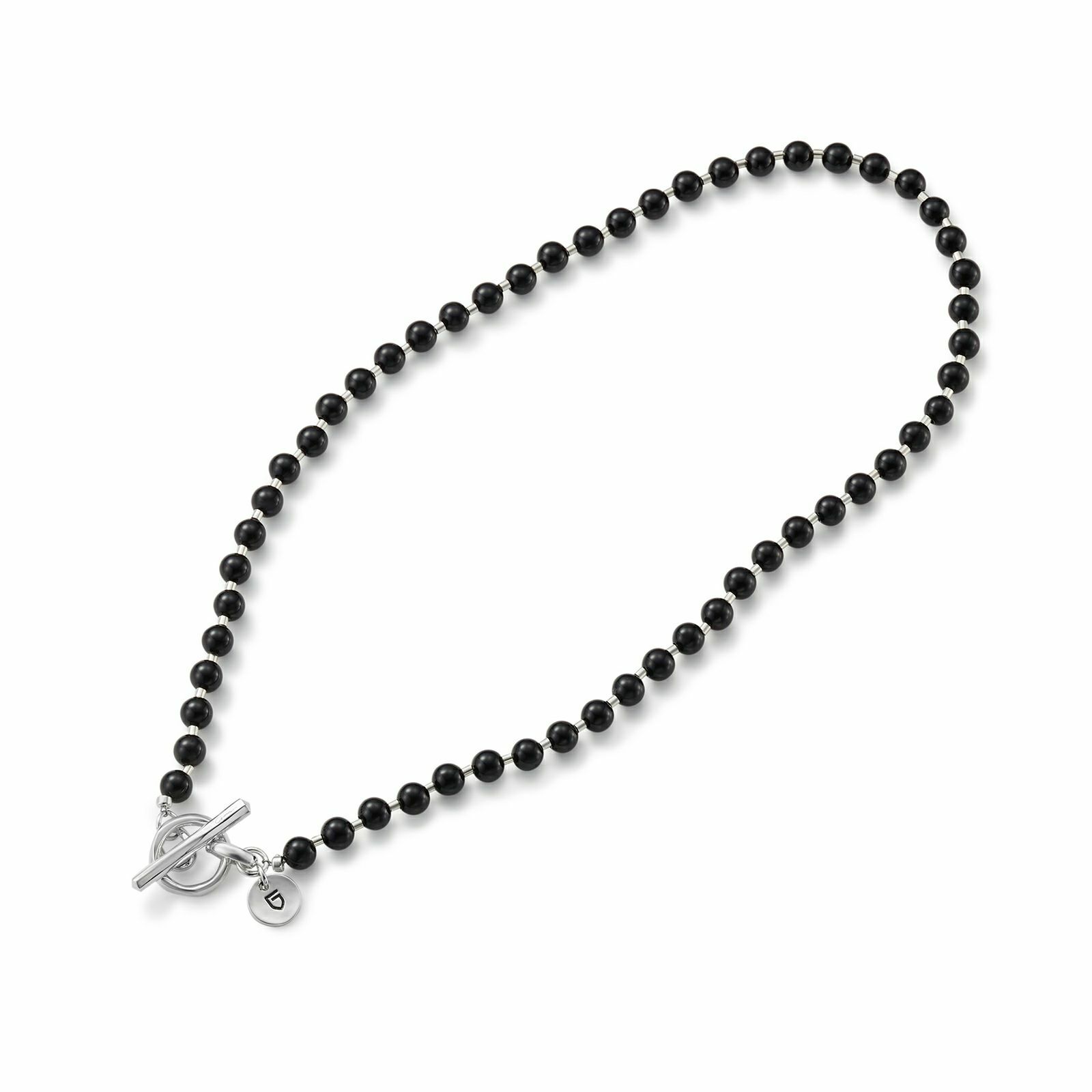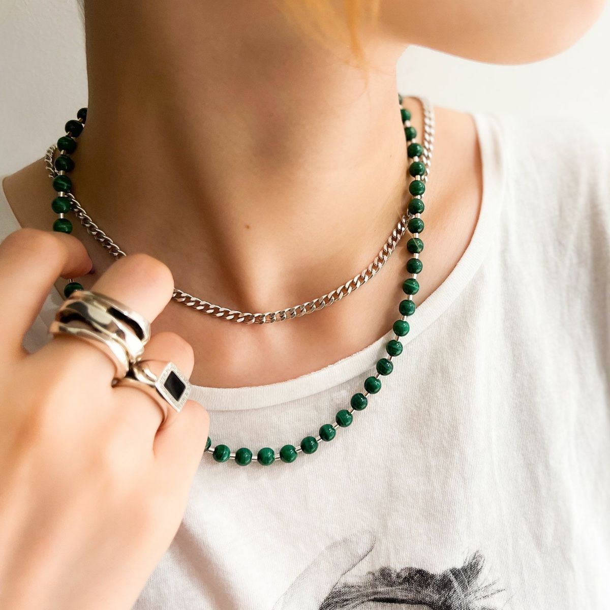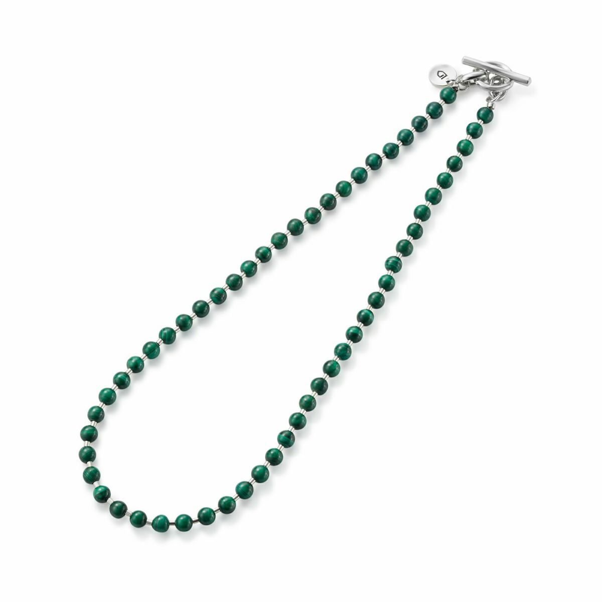 約6mm玉の天然石とパイプ型のシルバーパーツ用いてボールチェーンのようにデザインされたネックレスです。 シンプルなディテールですが、ガルニ独自のカッティングを施してオリジナルで製作したマンテル(留め具)がアクセントになっています。 洋服やジュエリーとカラーを合わせたり、違うカラーを合わせてコントラストを出したりとコーディネートを楽しめるデザインです。 オリジナルアクセサリーケース付き。