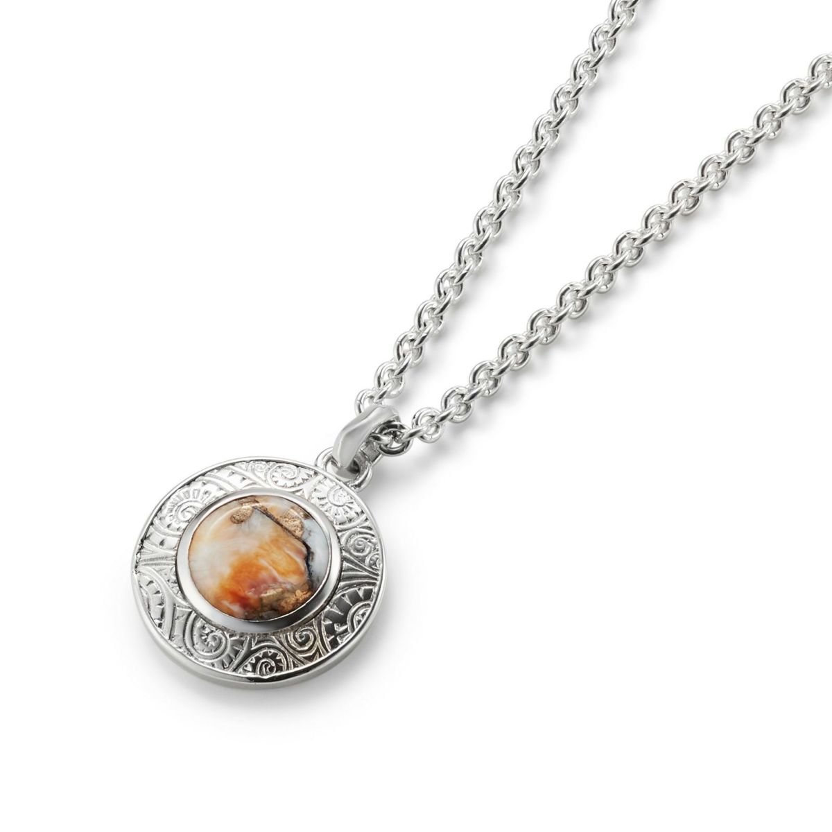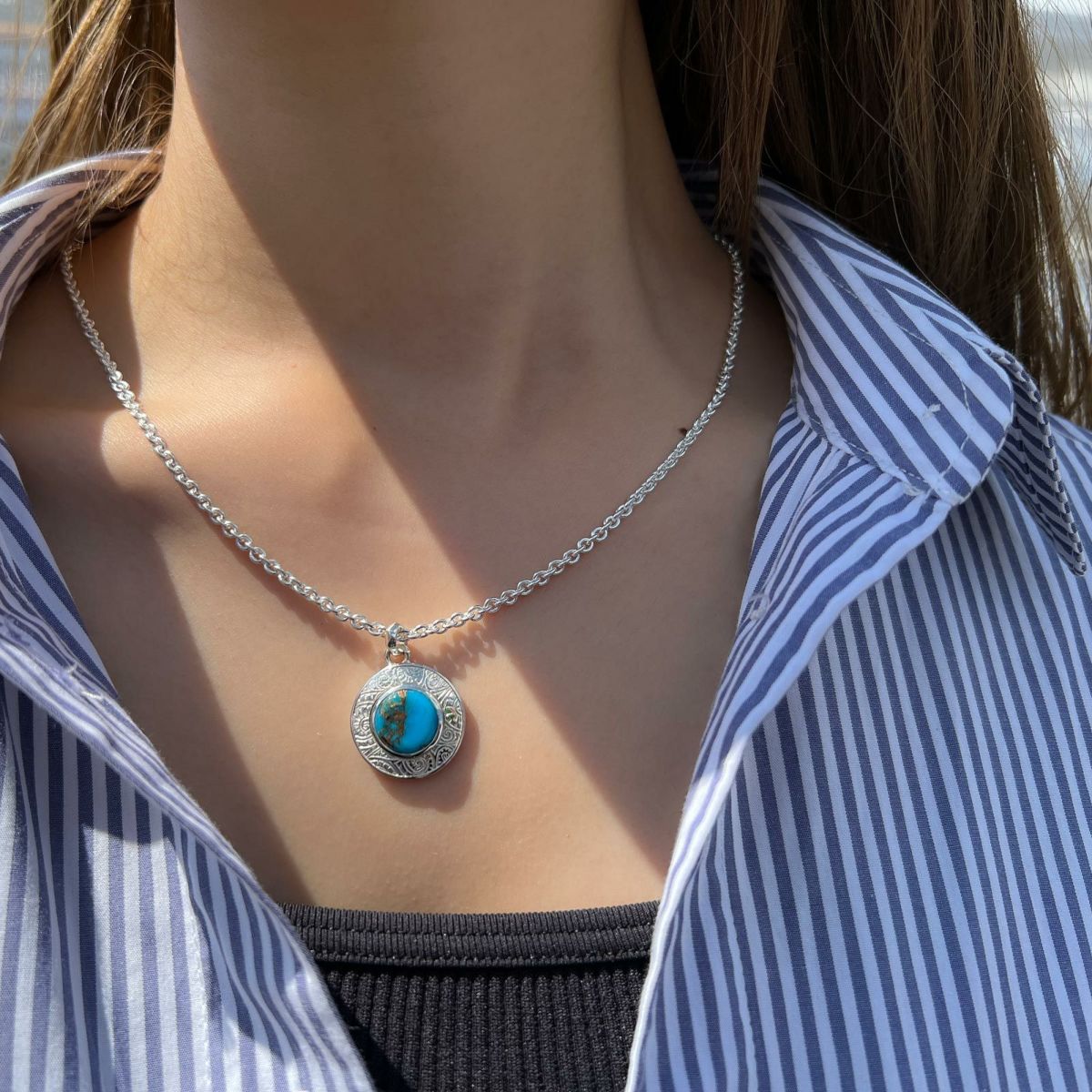 独特の風合いをもつオイスターカッパーターコイズをセッティングしたペンダントです。 周囲にオリジナルのツタ模様「バインパターン」を施しています。 アジャスターでチェーンの長さを7cm調整可能です。チェーンはペンダントトップから外れない仕様になっています。 オリジナルアクセサリーケース付き。