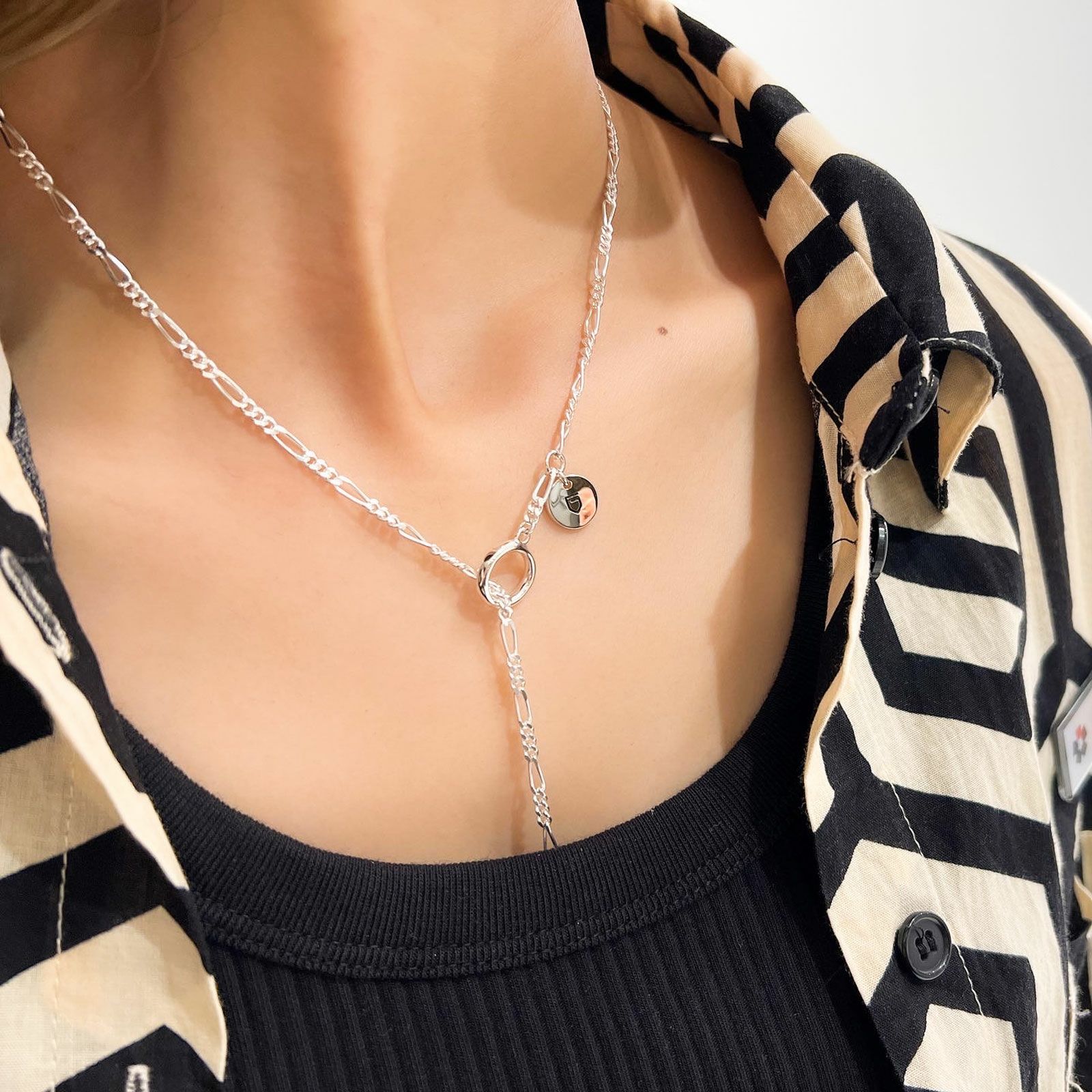 リズミカルで華やかな印象のフィガロチェーンを使用したラリエットネックレスです。 オリジナルアクセサリーケース付き。 ■デザイン オリジナルで製作したマンテル(留め具)を使用しています。カッティングを施したマンテルはスタイリングのアクセントになります。 ■素材 シルバー925 (スターリングシルバー) ■スタイル マンテルを後ろで留めてネックレスとして着用する他に、マンテルをフロントに持ってきたり、ロザリオ風にチェーンを垂らしたりと着用スタイルをお楽しみいただけます。 性別や年齢を問わず着用いただけます。 《注意事項》 ・フープに1度通しただけでは、使い方によって外れてしまう可能性があります。チェーンを2重にフープに通すと外れにくくなります。 ▼バリエーション ・Classic Chain - No.2 チェーンシリーズ >商品一覧はこちら 【DENOVA】COLLECTION >商品一覧はこちら