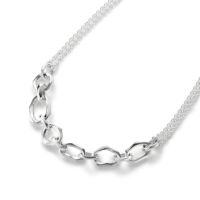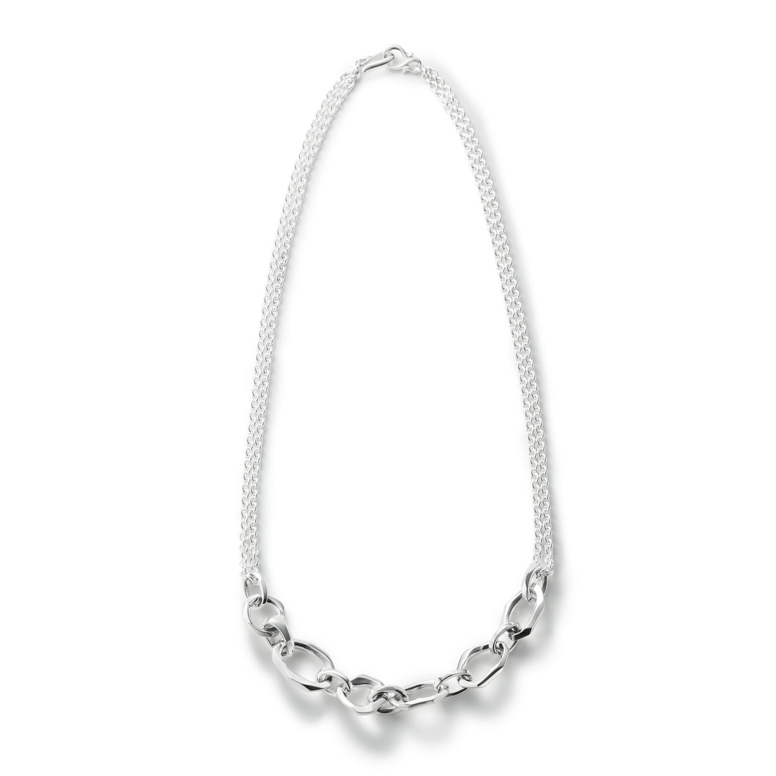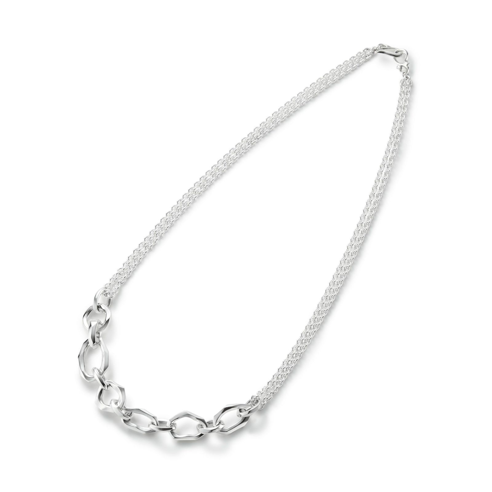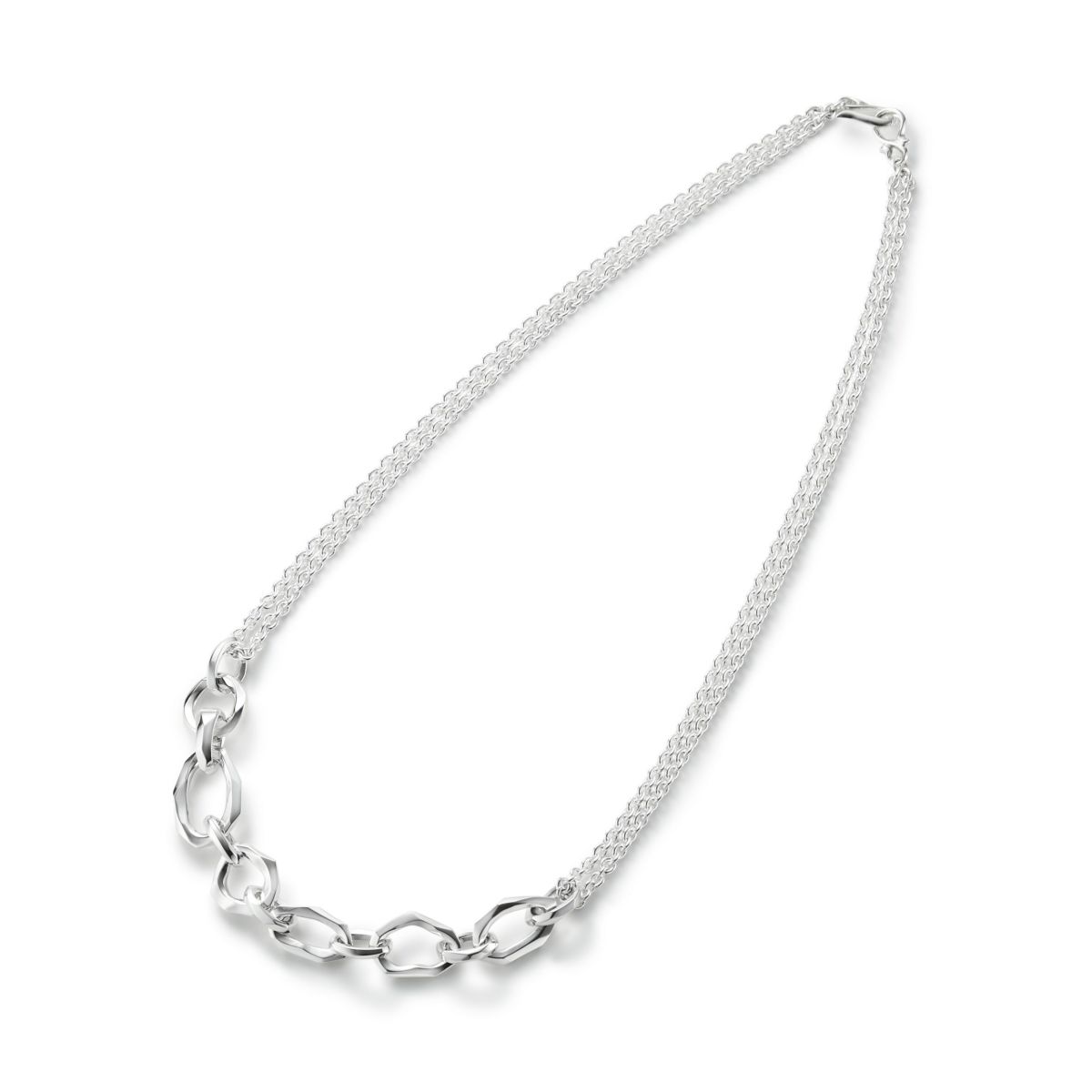 数種類のオリジナルパーツと、2重のチェーンを組み上げた上品な仕上がりは、コーディネートの脇役から主役になりうる一押しのデザインです。