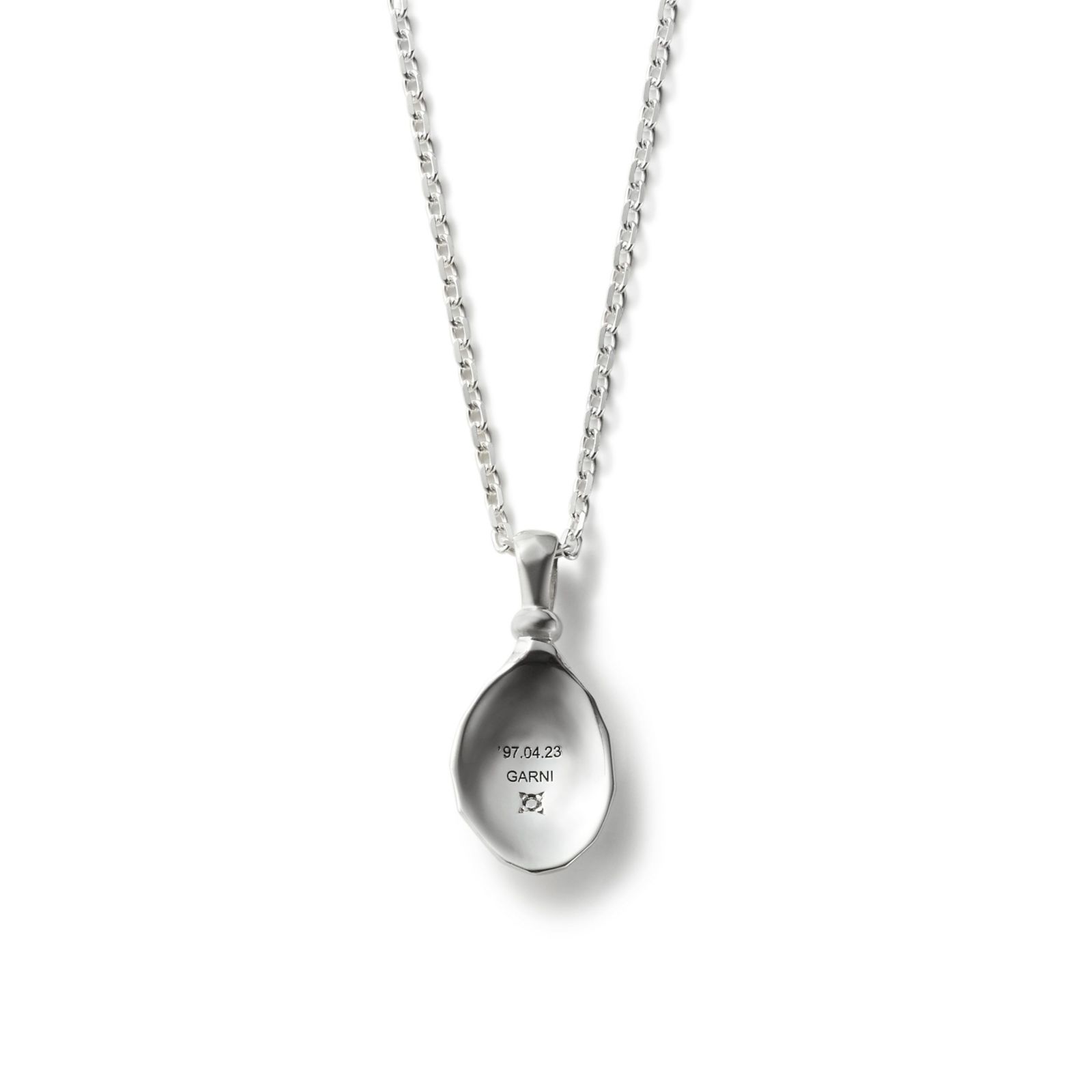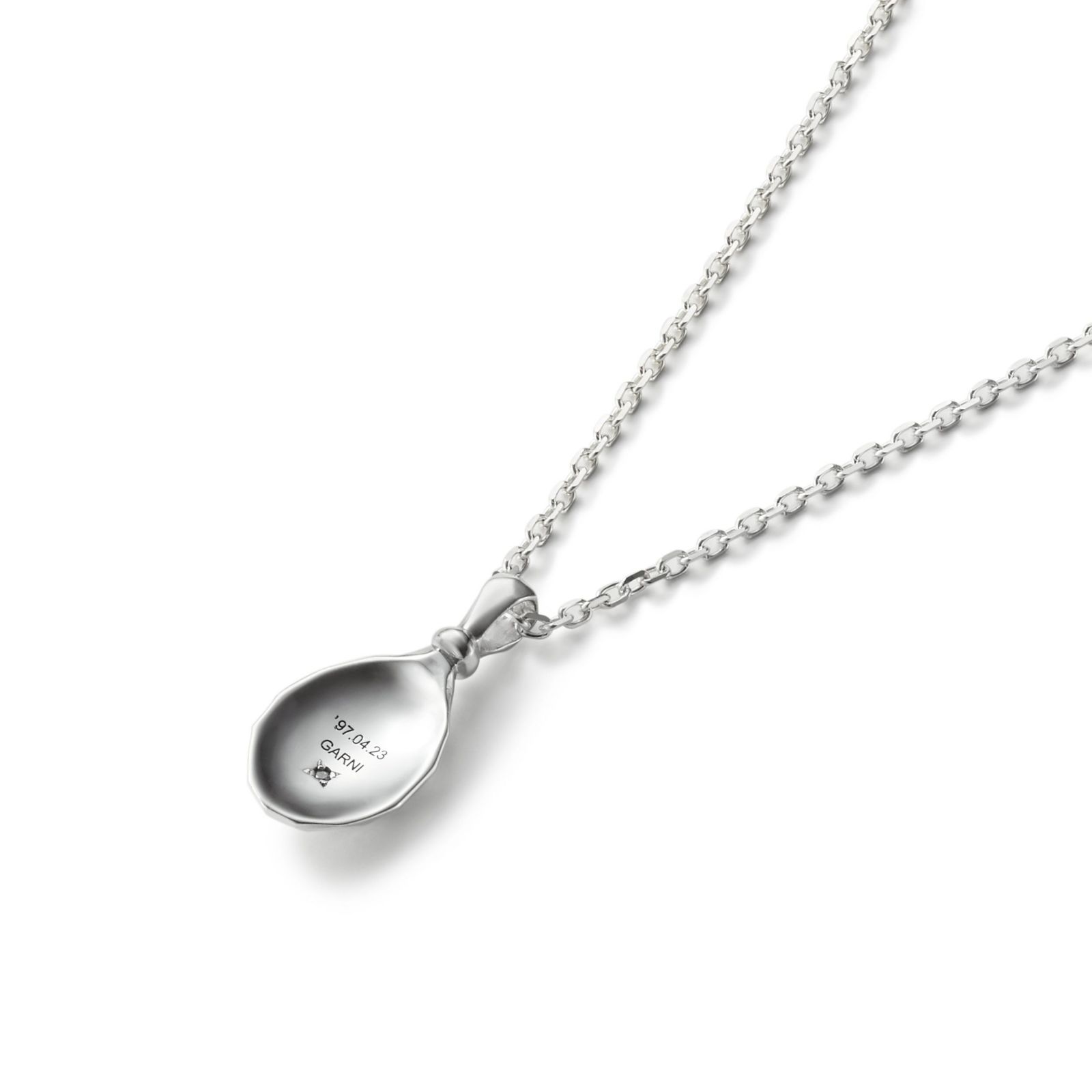 スプーンモチーフのペンダントです。スプーン表面に記念日などの日付やイニシャル、メッセージなどの刻印と誕生石の石留めを入れることが出来ます。