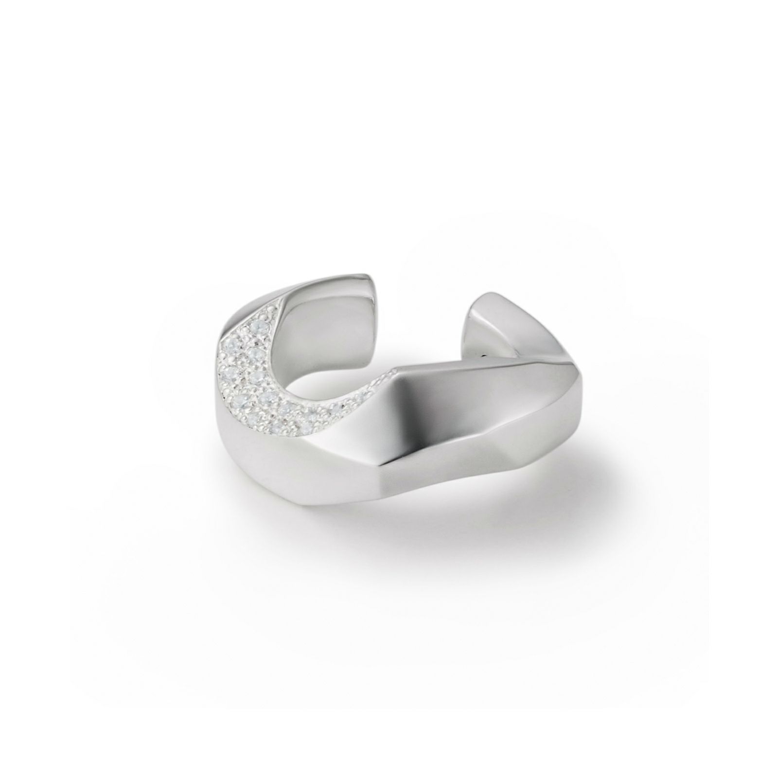なめらかながらエッジーなリングの形状に一箇所深く削り出した「チップ」のイヤーカフです。 削り出した面に0.9mmのキュービックジルコニアを14ピースセットしています。 オリジナルアクセサリーケース付き。