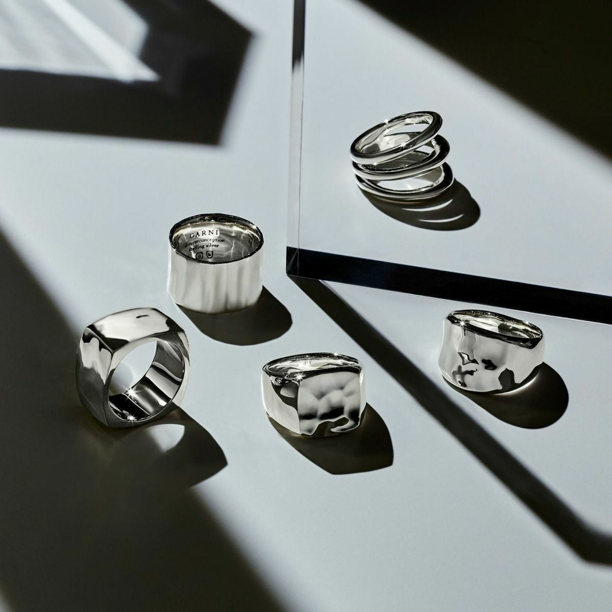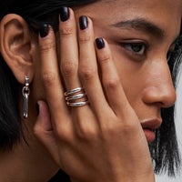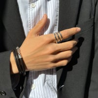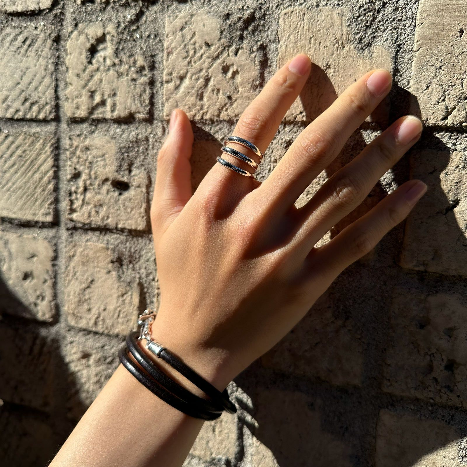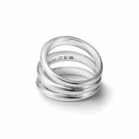 表面にさりげなくテクスチャーを施した「セイマ」のリングです。No.3はプレーンなリングを3連に重ね着けしているように見えるデザインです。