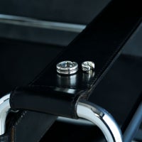 ■デザイン バウハウスを代表するデザイナーの一人マルセル・ブロイヤーの作品「ワシリーチェアー」のスチールパイプのフォルムをモチーフに、中央には細いラインをデザインに加えています。 細いライン部分はいぶし加工を施し、陰影で立体感を際立たせてさりげないアクセントになっています。 着けてみると馴染みが良い滑らかな曲線で仕上げています。