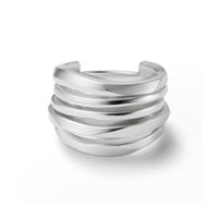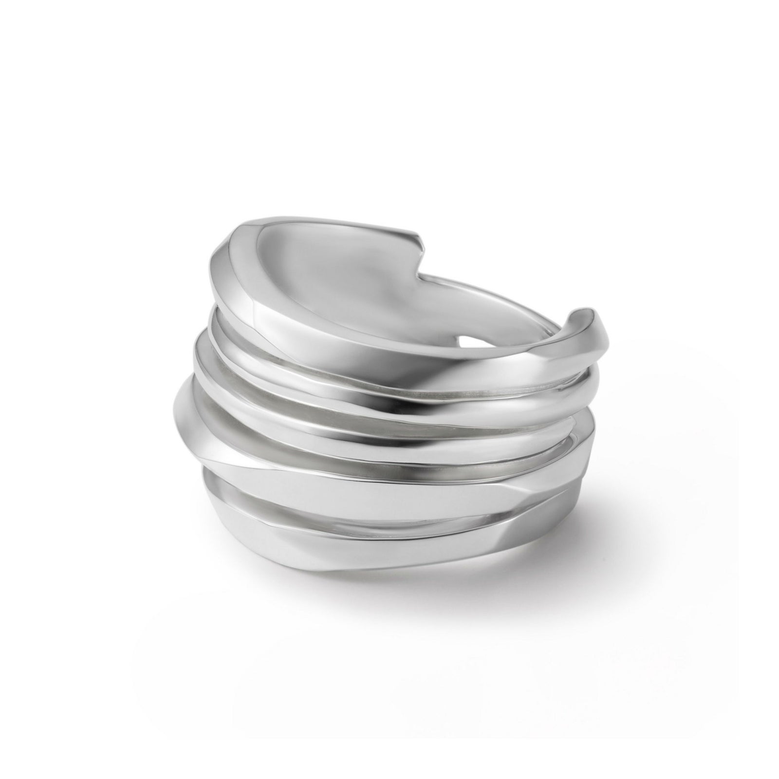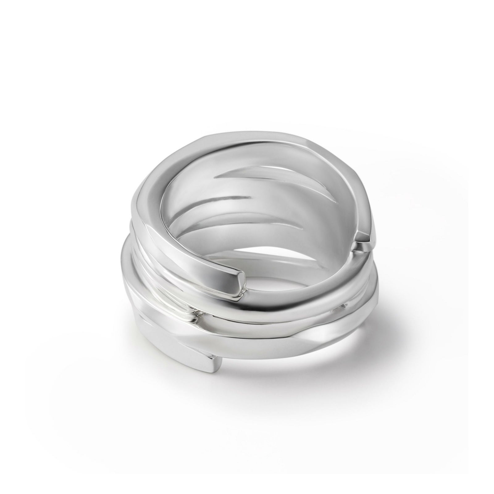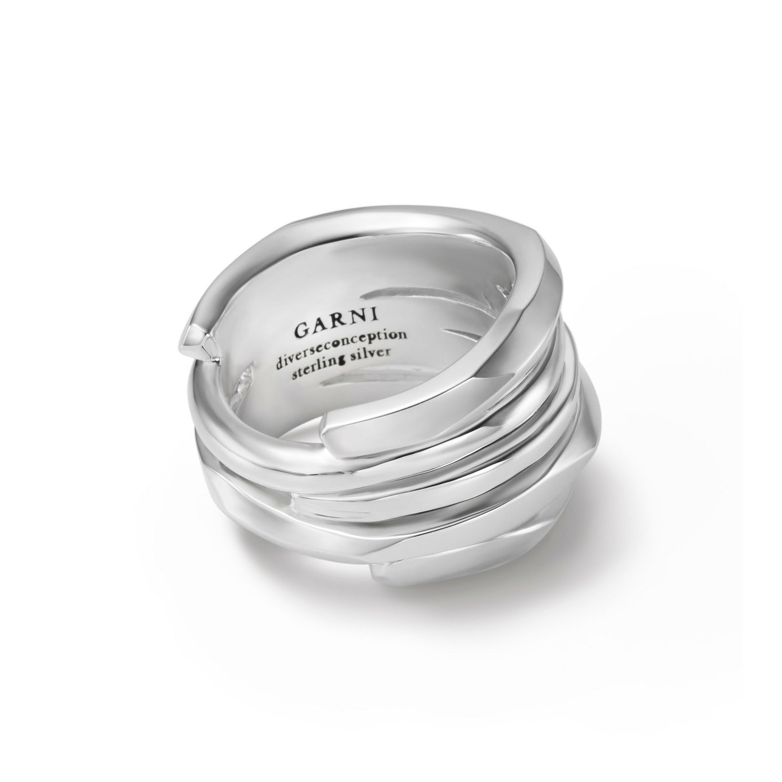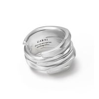ブランド独自のカッティングを施したリングとプレーンな形状で作られたリングを重ねたように一体化で表現しています。太さや厚みにも変化をつけて表情にアクセントを加えています。