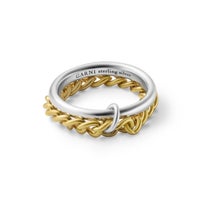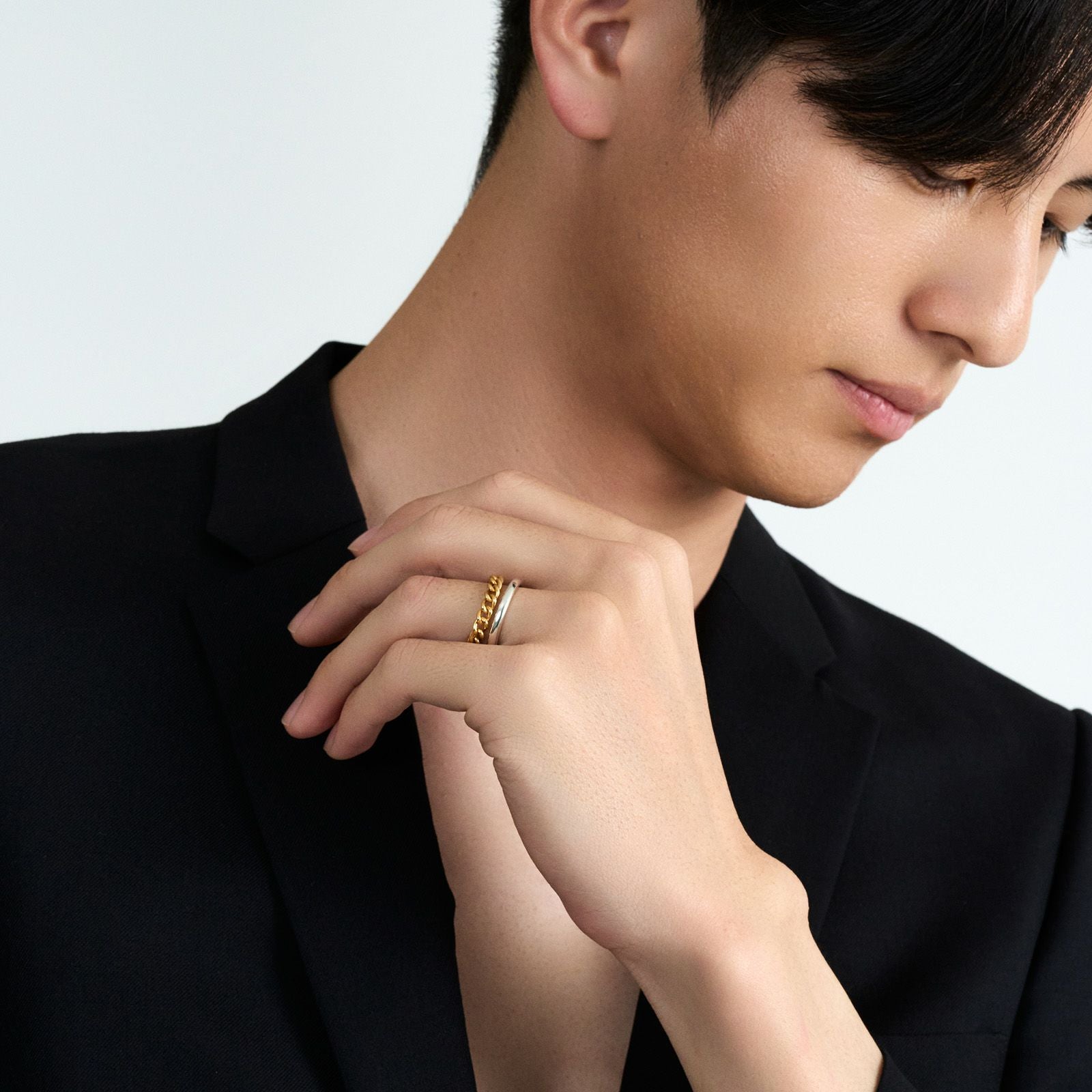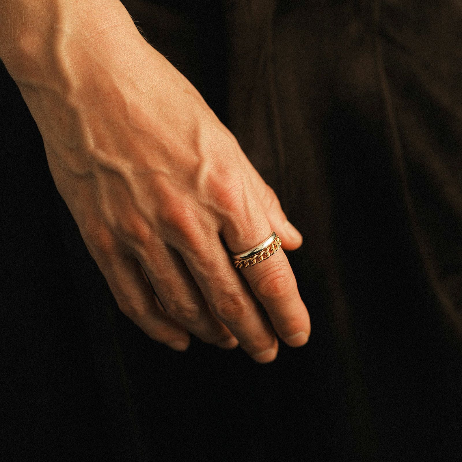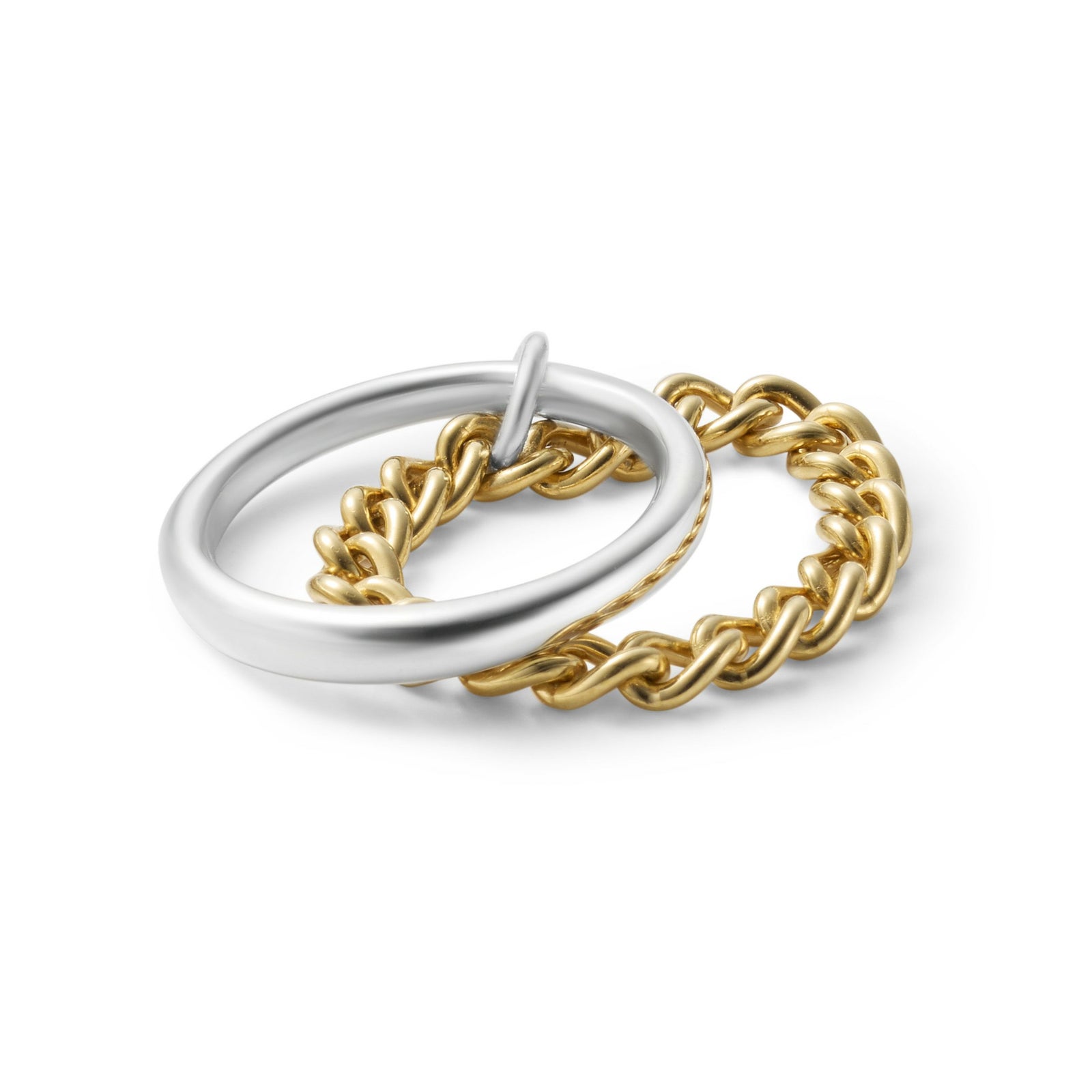 甲丸リングと喜平チェーンリングを組み合わせて、ひとつで重ね付けのように見えるデザインです。
